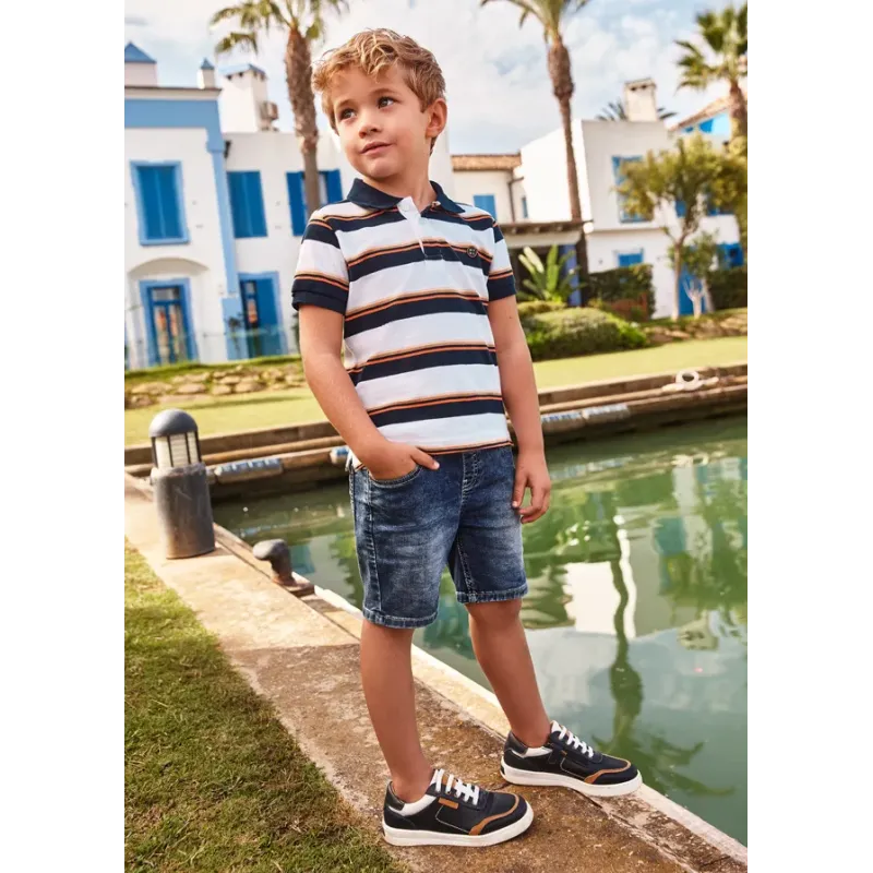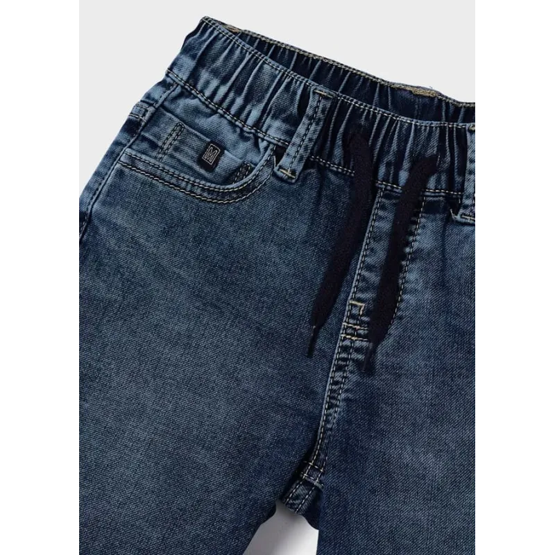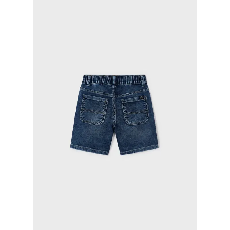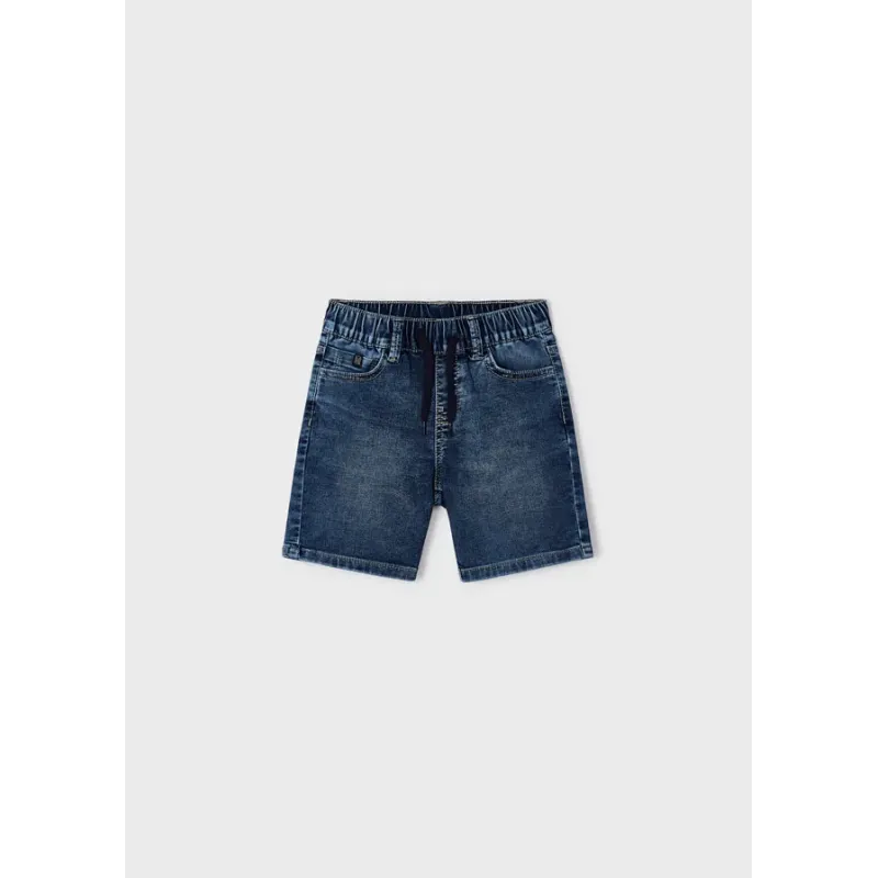 Krótkie spodnie typu bermudy dla chłopca Baby. Imitacja rozporka. Pasek z elastyczną gumą i guzikiem. Wygodna i trwała tkanina z serży. Ze szlufkami w pasie. Model z pięcioma kieszeniami. Model gładki. Artykuł ten jest specjalnie barwiony.