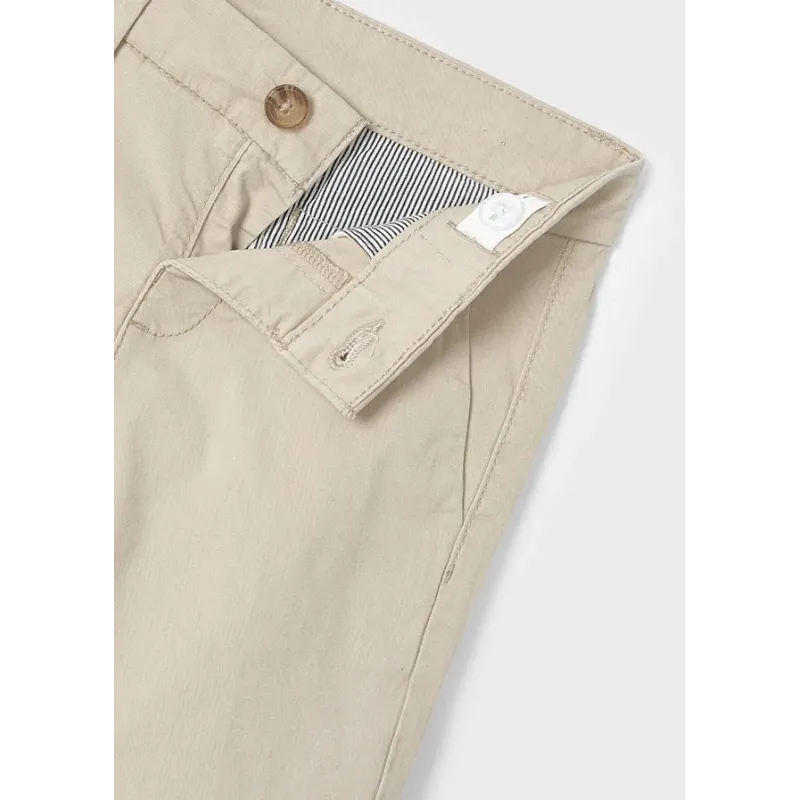 Krótkie spodnie typu bermudy dla chłopaka. Elegancki model chino. Pasek z elastyczną gumą i zapięciem na suwak i guzik. Wygodna i trwała tkanina z serży. Model z pięcioma kieszeniami. Model gładki. Skład: 98% Bawełna, 2% Elastan.