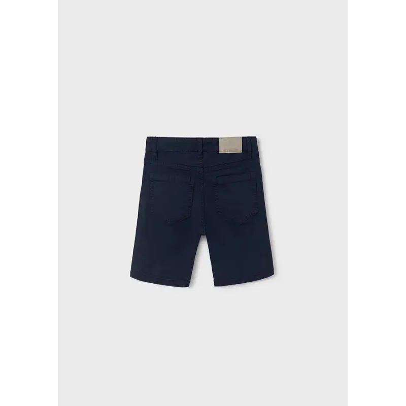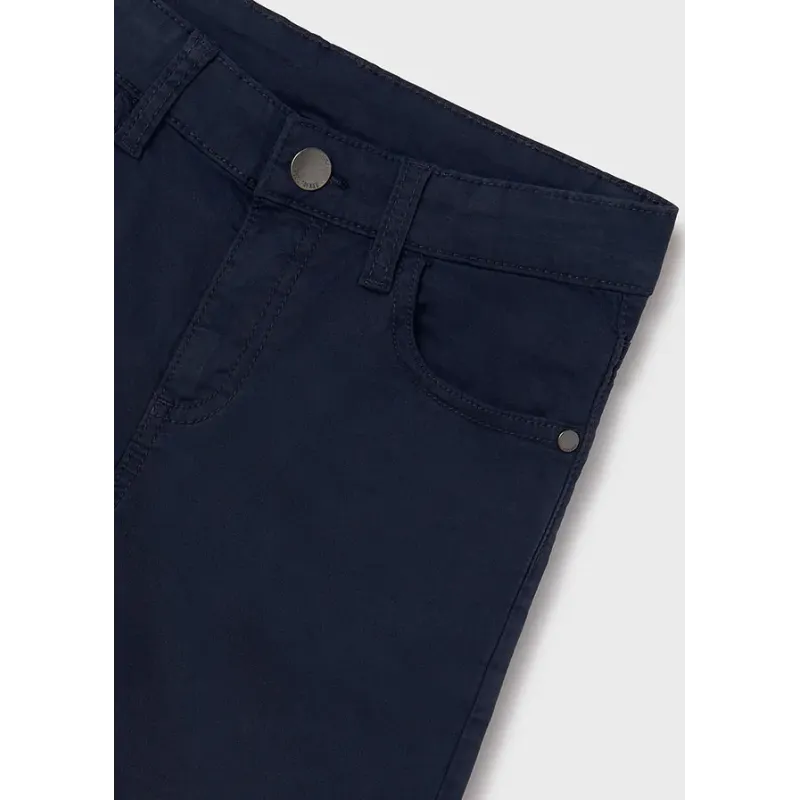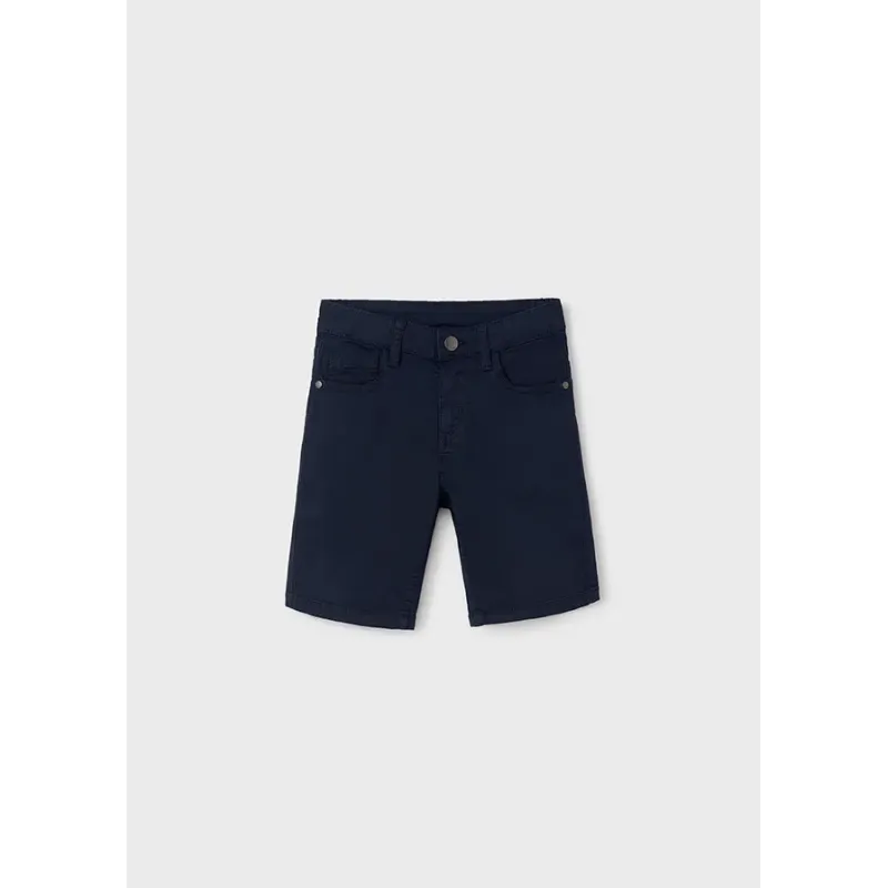 Krótkie spodnie typu bermudy dla chłopca Baby. Imitacja rozporka. Pasek z elastyczną gumą i guzikiem. Wygodna i trwała tkanina z serży. Ze szlufkami w pasie. Model z pięcioma kieszeniami. Model gładki. Artykuł ten jest specjalnie barwiony.