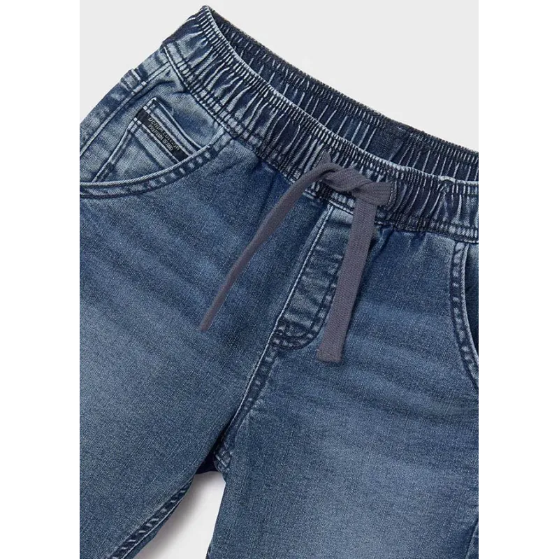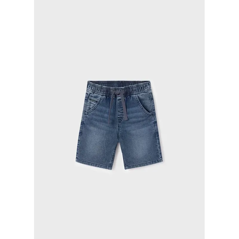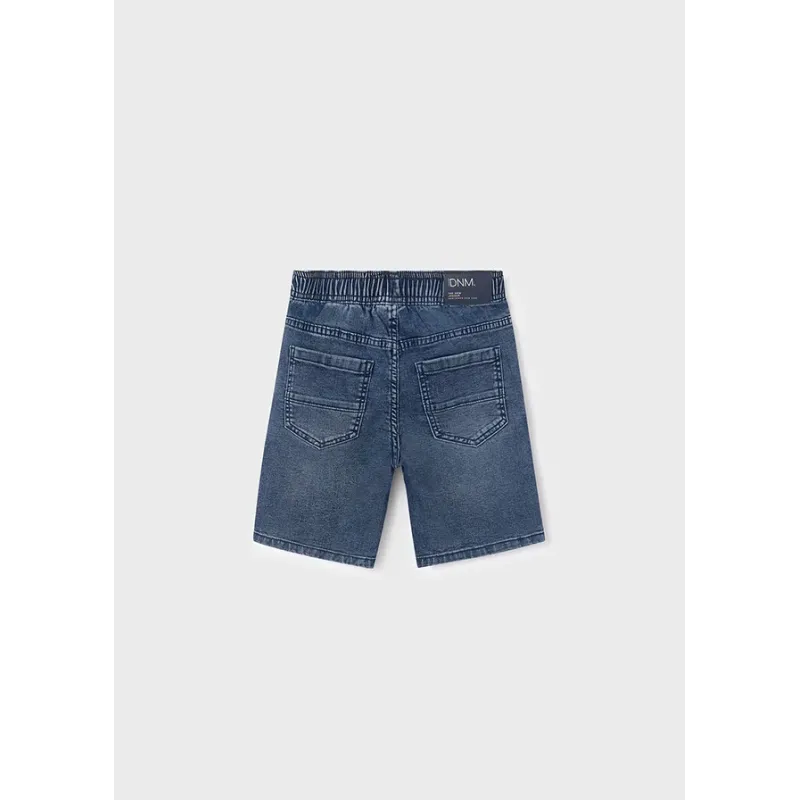 Krótkie spodnie typu bermudy dla chłopaka. Elastyczny pas ze sznurkiem do regulacji. Nowoczesna tkanina jeansowa z efektem sprania i użytkowania. Skład: 81% Bawełna 17% Poliester 2% Elastan