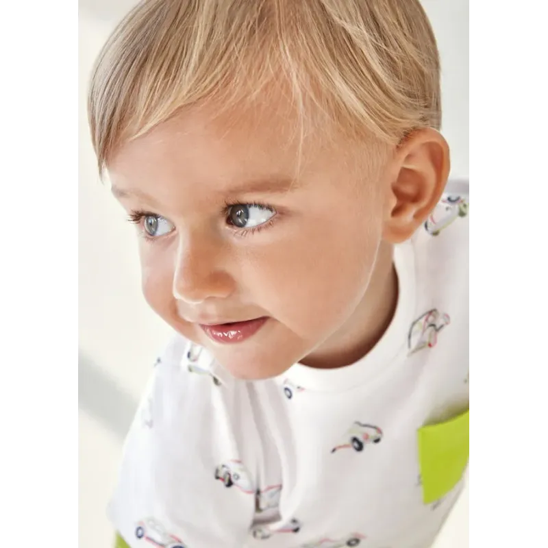 Koszulka z krótkim rękawem dla chłopca. Zapięcie na guziki na ramieniu dla lepszego dopasowania ubranka. Model z ruchomą aplikacją z interaktywnej kolekcji PLAY WITH. Skład: 100% Bawełna
