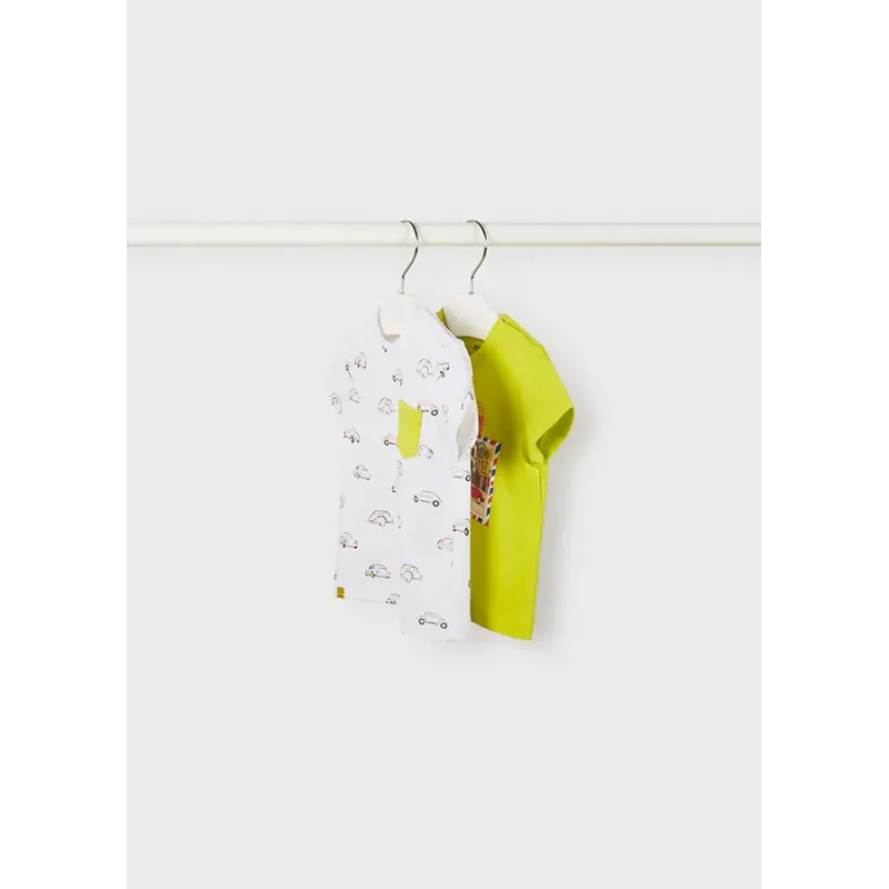 Zestaw dwóch koszulek z krótkim rękawem dla chłopca Baby. Okrągły dekolt. Zapięcie na jeden guzik przy dekolcie z przodu. Artykuły wykonane ze 100% bawełny. Ozdoby: grafika na przodzie.