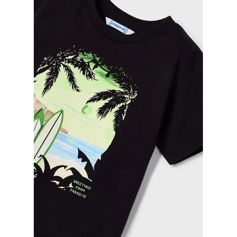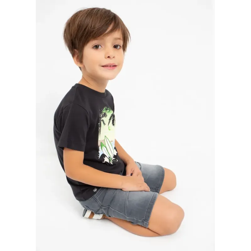 Ubranko ECOFRIENDS 100% zrównoważona bawełna. Koszulka z krótkim rękawem dla chłopca. Okrągły dekolt. Motywy dekoracyjne w stylu surf.