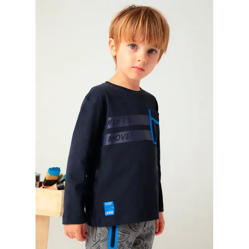 Koszulka z długim rękawem dla chłopca. Okrągły dekolt. Koszulka wykonana ze 100% bawełny. Model z napisem.