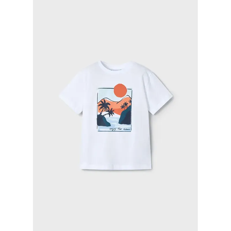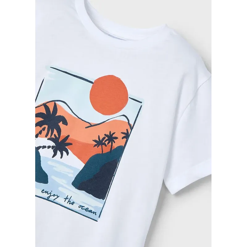 Koszulka z krótkim rękawem dla chłopca Baby. Okrągły dekolt. Model o prostym kroju. Zapięcie na małe zatrzaski na ramieniu, które ułatwiają założenie ubranka. Wygodna dzianina. Model z kieszonką i z nadrukami. Skład: 87% Bawełna 13% Poliester