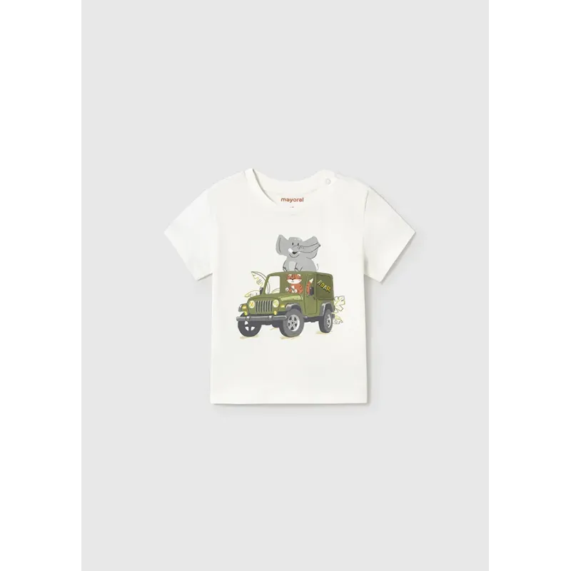 Koszulka z krótkim rękawem dla chłopca Baby. Okrągły dekolt. Zapięcie na małe zatrzaski na ramieniu, które ułatwiają założenie ubranka. Artykuł wykonany ze 100% bawełny. Ozdoby: grafika na przodzie.