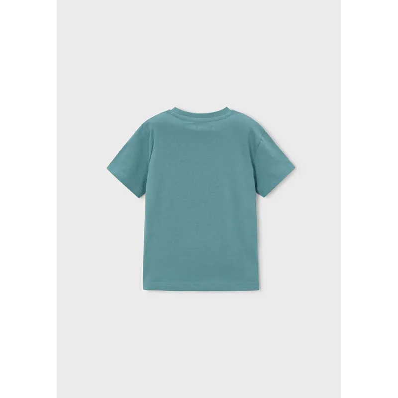 Koszulka z krótkim rękawem dla chłopca Baby. Okrągły dekolt. Delikatna i elastyczna bawełna. Z przodu funkcjonalna kieszeń. Ozdoby: grafika na przodzie i na tyle ubranka.