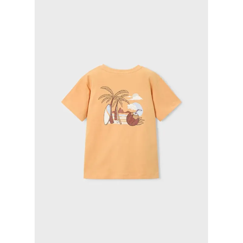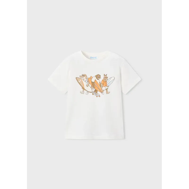 Koszulka z krótkim rękawem dla chłopca. Okrągły dekolt. Model o prostym kroju. Zapięcie na małe zatrzaski na ramieniu, które ułatwiają założenie ubranka. Wygodna dzianina. Ozdoby: nadruk z przodu z otwieranym okienkiem. Skład: 100% Bawełna