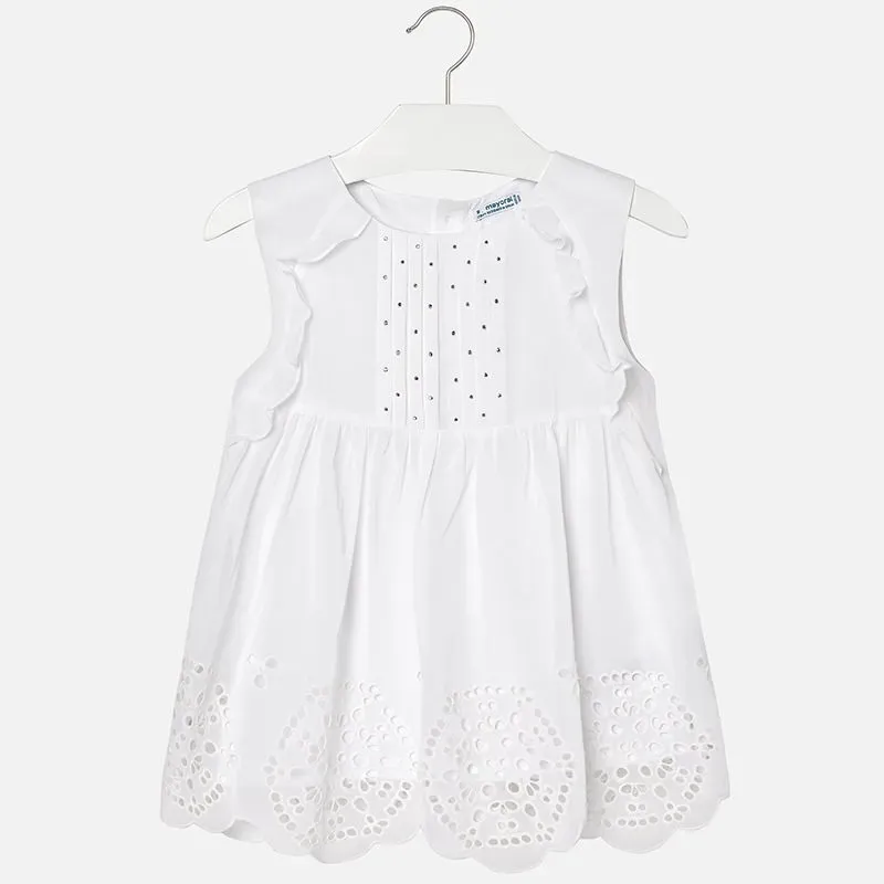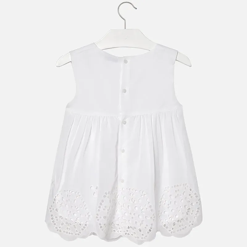 Bluzka z krótkim rękawem dla dziewczynki. Okrągły dekolt. Małe zapięcie na plecach na guziczek dla sprawniejszego zakładania ubranka. Model z haftami. Artykuł wykonany ze 100% bawełny.