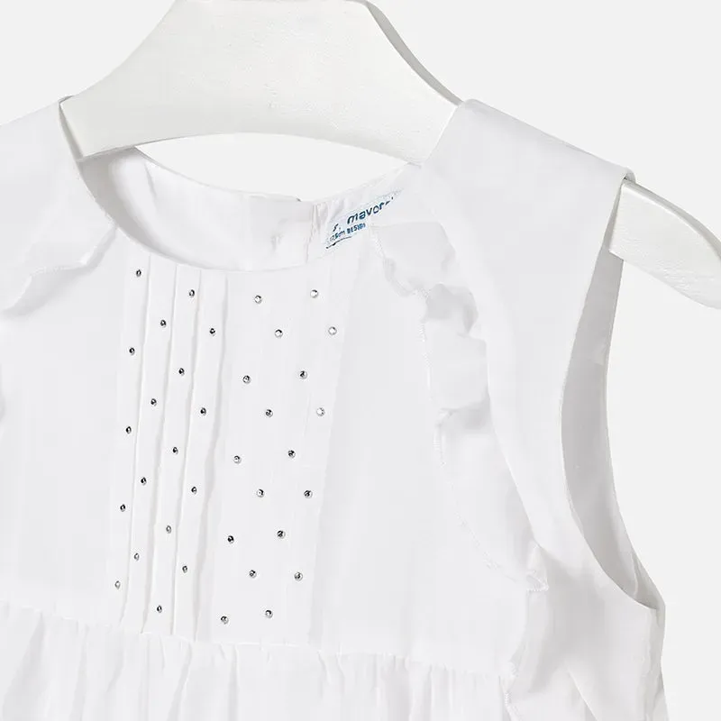 Elegancka bluzka z krótkim rękawem dla dziewczynki. Okrągły dekolt z kołnierzykiem. Zapięcie na guziki z przodu. Model z odcięciem w klatce piersiowej. Plisowany dół. Lekki i zwiewny materiał. Skład: 84% Poliester, 16% Bawełna.