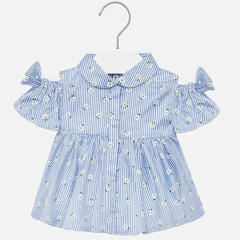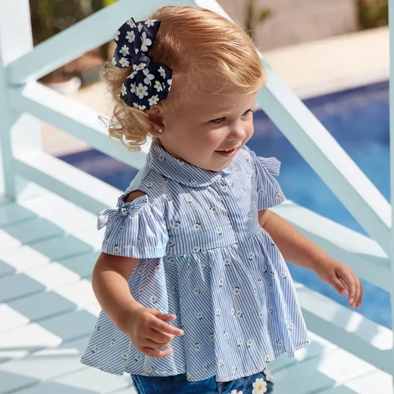 Elegancka bluzka z krótkim rękawem dla dziewczynki. Okrągły dekolt z kołnierzykiem. Zapięcie na guziki z przodu. Model z odcięciem w klatce piersiowej. Plisowany dół. Lekki i zwiewny materiał. Skład: 84% Poliester, 16% Bawełna.