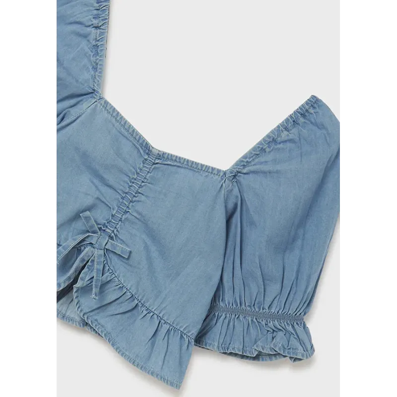 Bluzka z krótkim rękawem z odkrytymi ramionami dla dziewczynki. Model z falbankami.