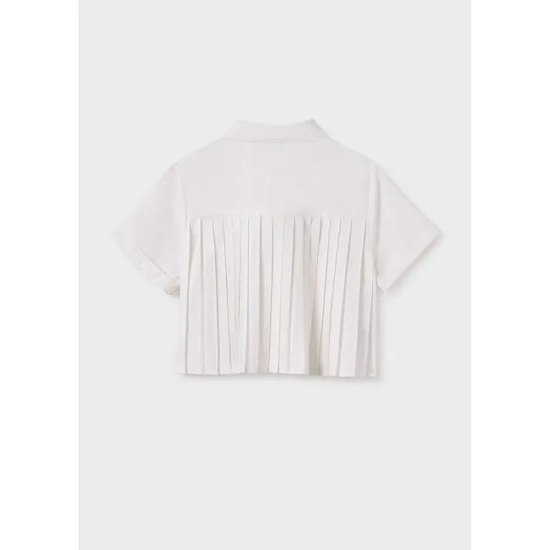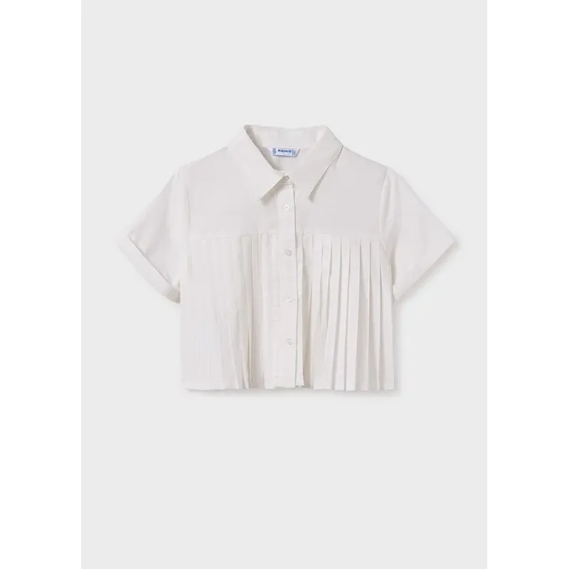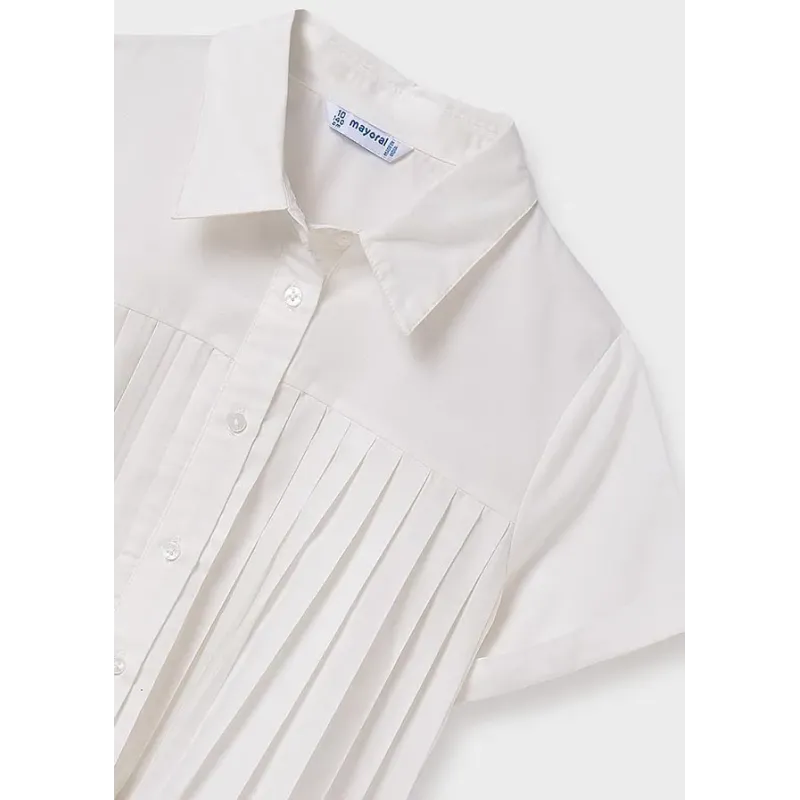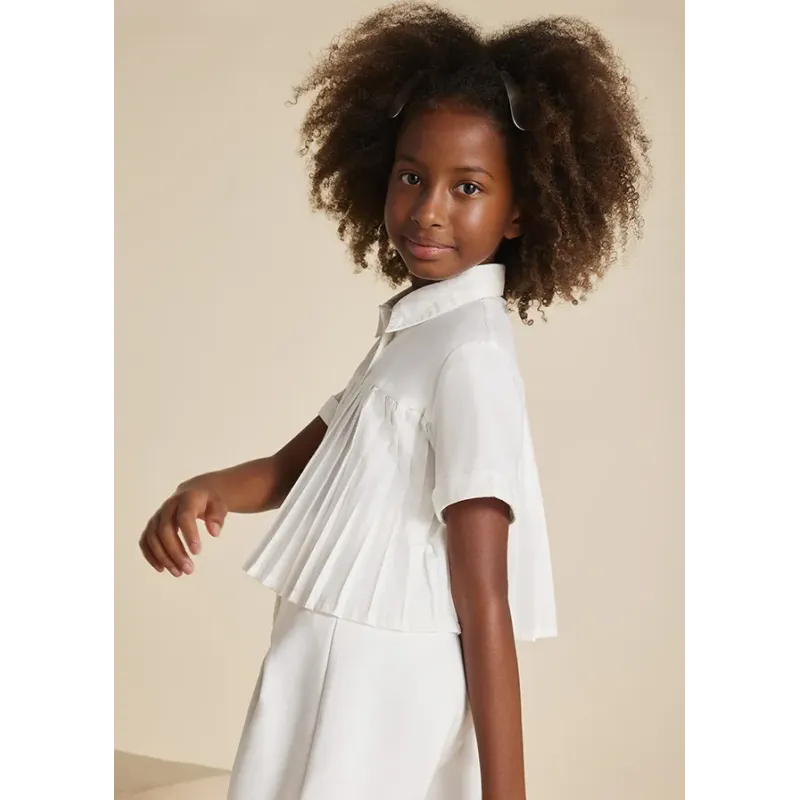 Elegancka bluzka z krótkim rękawem dla dziewczynki. Okrągły dekolt z kołnierzykiem. Zapięcie na guziki z przodu. Model z odcięciem w klatce piersiowej. Plisowany dół. Lekki i zwiewny materiał. Skład: 84% Poliester, 16% Bawełna.