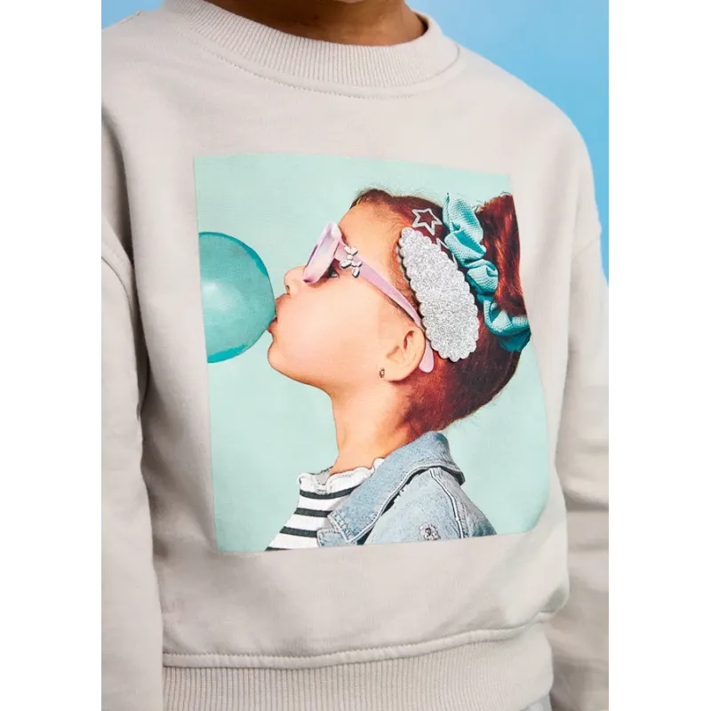 Bluza z długim rękawem dla dziewczynki ze ściągaczami. Okrągły dekolt. Bufiasty rękaw. Model z nadrukiem. W zestawe z bluzą, pasująca spinka do włosów, z możliwością wpięcia jej do bluzy. Skład: 59% Bawełna, 40% Poliester, 1% Elastan.