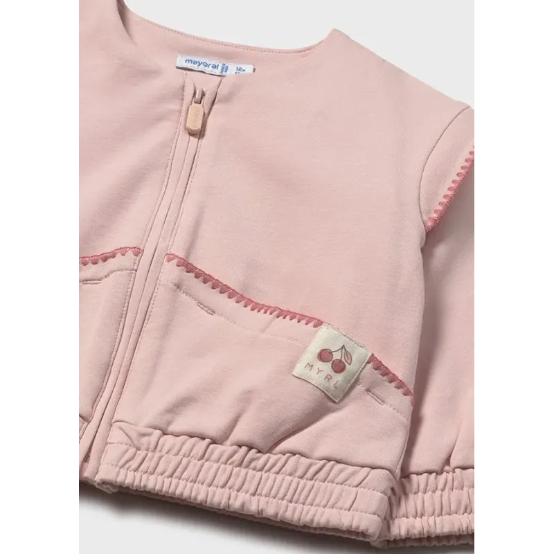 Ubranko ECOFRIENDS, zawiera bawełnę zrównoważoną. Bluza zapinana na zamek błyskawiczny z długim rękawem dla dziewczynki. Zapięcie na środku na zamek błyskawiczny. Ozdoby: ozdobny haft, ozdobne falbanki.