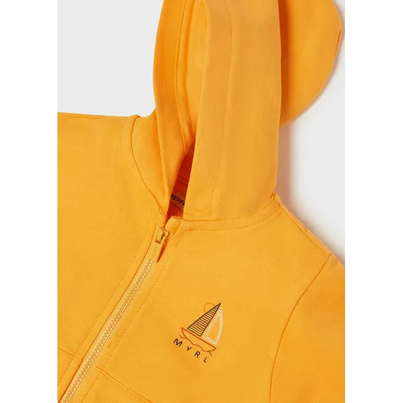 Bluza z długim rękawem dla chłopca. Model z kapturem. Zapięcie na środku na zamek błyskawiczny. Z przodu funkcjonalne kieszenie. Skład: 60% Bawełna, 39% Poliester, 1% Elastan.