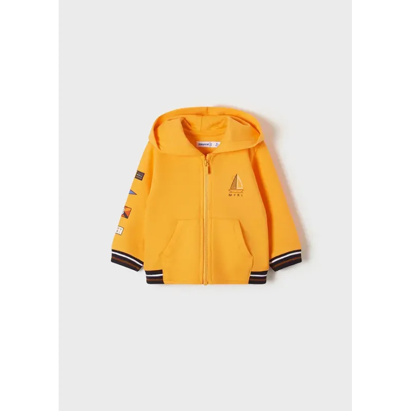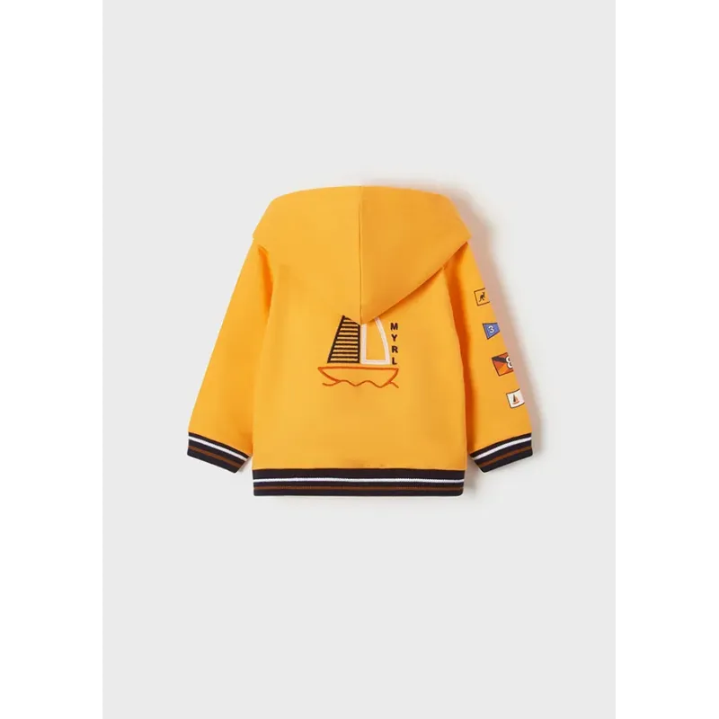 Bluza z długim rękawem dla chłopca Baby. Okrągły dekolt. Ubranko z kapturem. Zapięcie na zamek błyskawiczny. Delikatna i elastyczna bawełna. Z przodu funkcjonalne kieszenie. Ozdoby: ozdobne aplikacje.