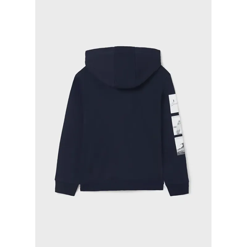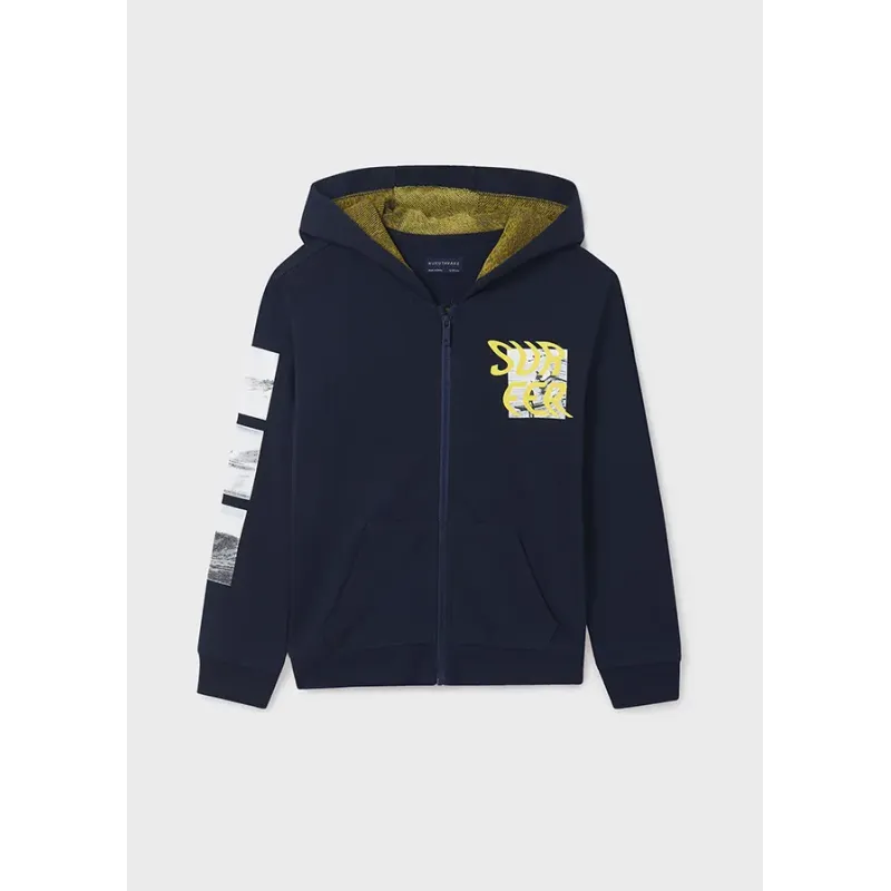 Gładka bluza z kapturem z długim rękawem dla chłopca. Zapięcie na środku na zamek błyskawiczny. Z przodu kieszenie zapinane na zamek. Skład: 60% Bawełna, 40% Poliester.