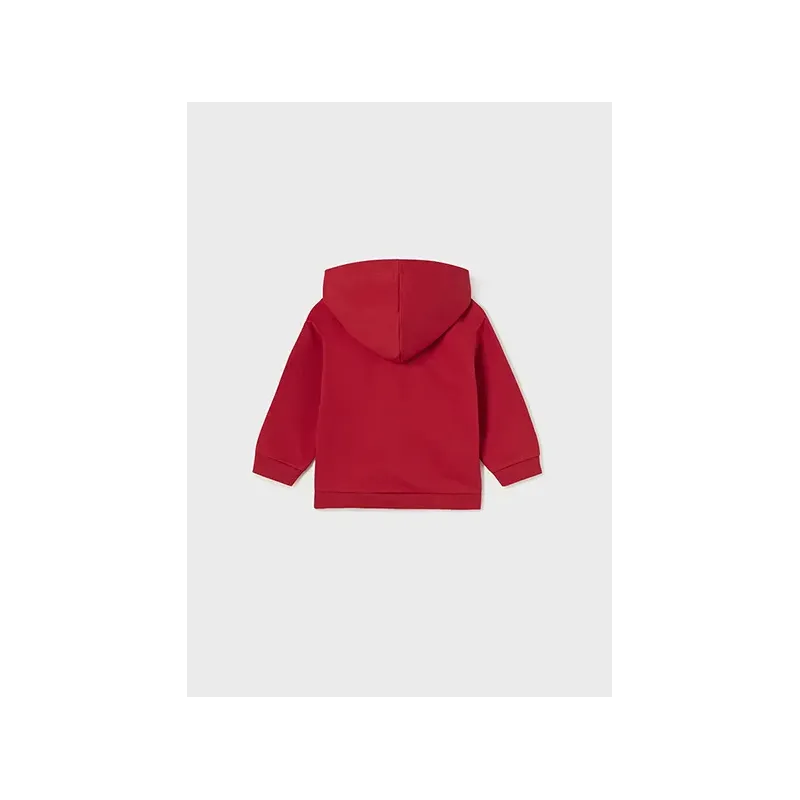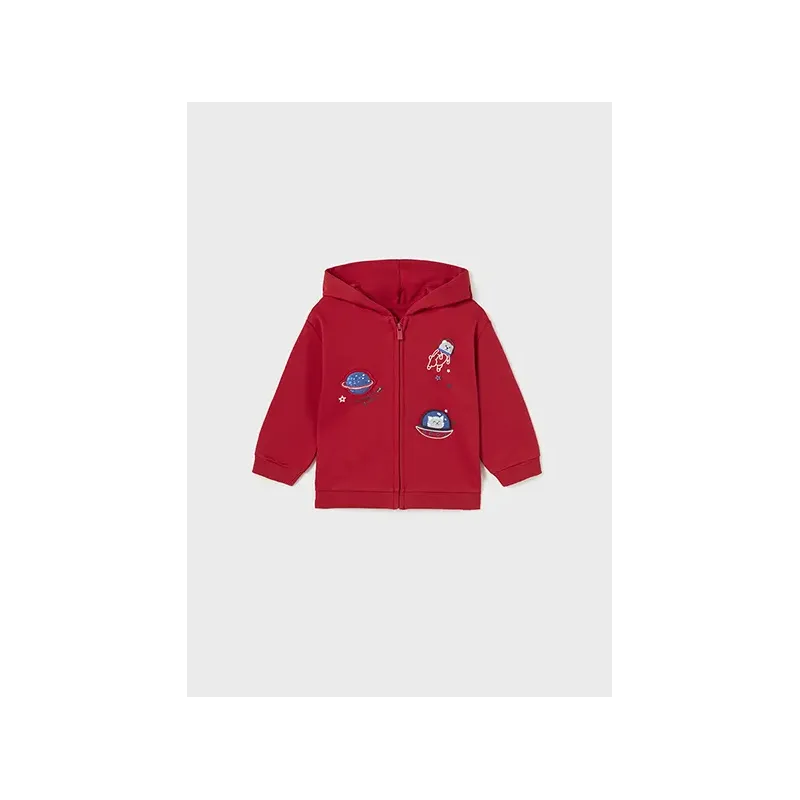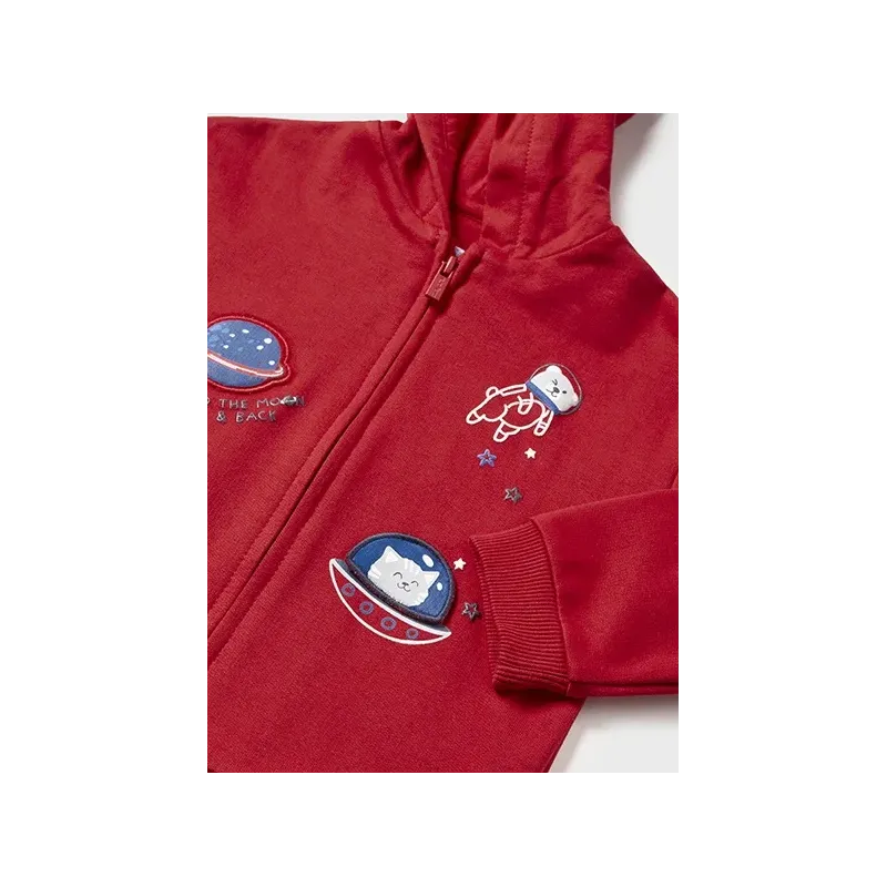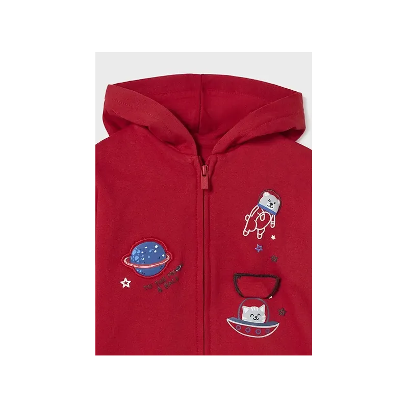 Bluza z długim rękawem dla chłopca Baby. Okrągły dekolt. Kontrastowy kaptur. Zapięcie na środku na zamek błyskawiczny. Delikatna i elastyczna bawełna. Z przodu funkcjonalne kieszenie. Ozdoby: ozdobne aplikacje, ozdobny haft.