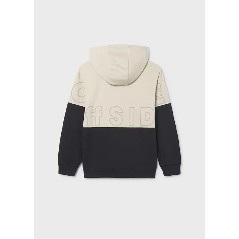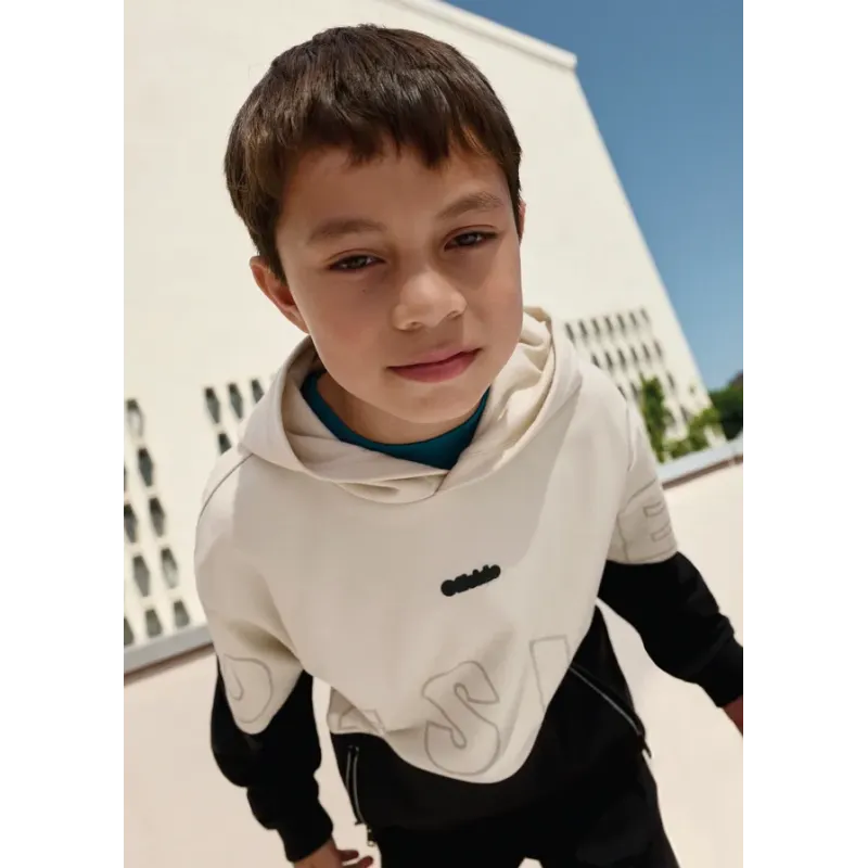 Żakardowa bluza z napisami na rękawach dla chłopca. Kołnierz z kapturem. Zapięcie na środku na zamek błyskawiczny. Kieszenie z przodu. Skład: 57% Bawełna, 42% Poliester, 1% Elastan.