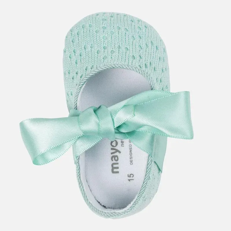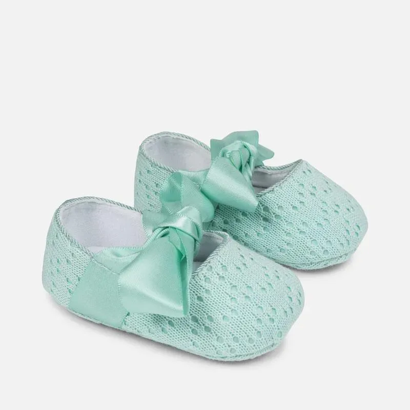 Oryginalny zestaw 2-częściowy dla dziewczynki. Buty typu balerinki dla noworodka, w klasycznym i ponadczasowym stylu do najbardziej eleganckich stylizacji. Lekka, antypoślizgowa podeszwa. Zapięcie na regulowany rzep.