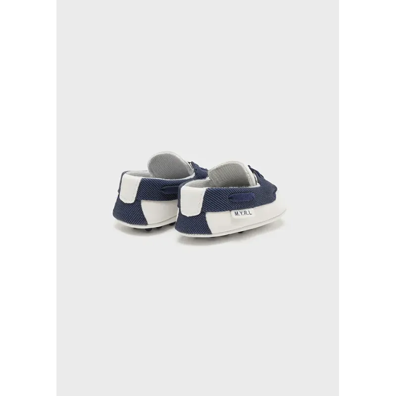 Bardzo praktyczne buciki ze sznurowadłami dla noworodka chłopca. Buty z wyściółką wewnętrzną i podeszwą wewnętrzną z oddychającej bawełny. Zewnętrzna część wykonana z materiału tekstylnego z elementami lnu i eko-skóry.