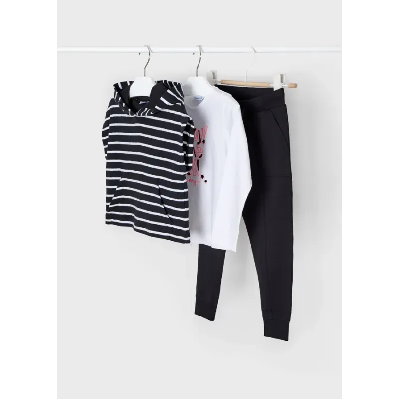 Dres 3-częściowy ECOFRIENDS dla dziewczynki składający się z bluzy z krótkim rękawem, bluzki z długim rękawem oraz spodni dresowych ze ściągaczem.