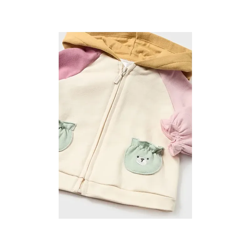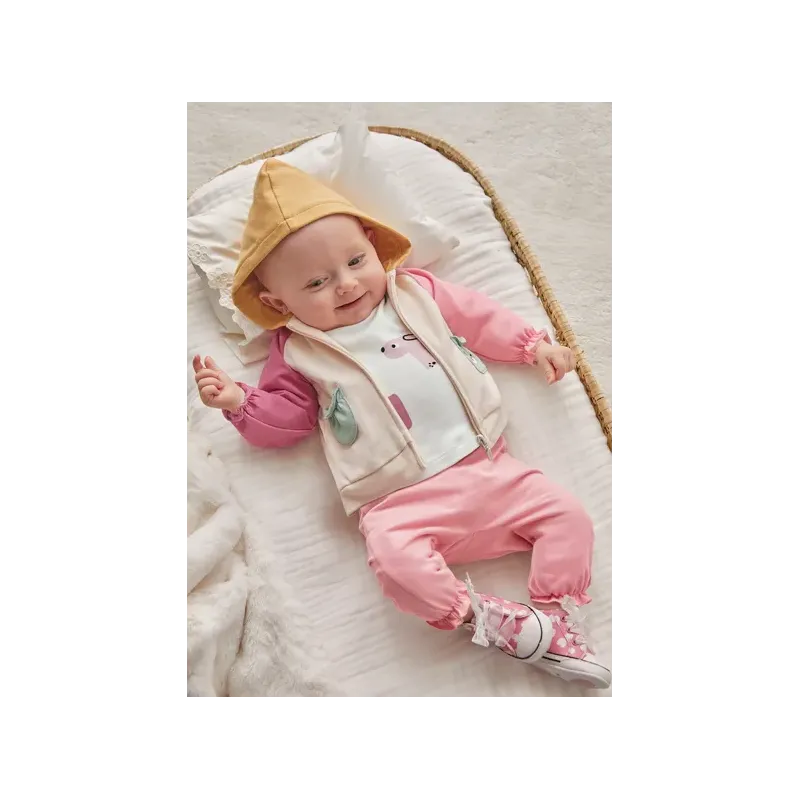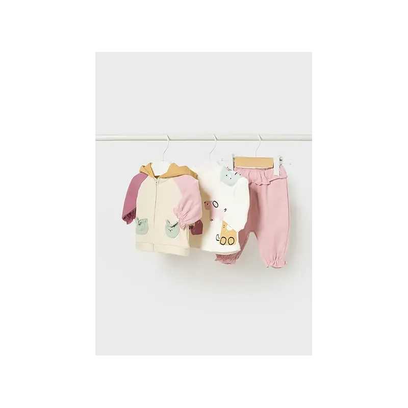 Dres 3 częściowy dla dziewczynki od 6 do 36 miesięcy z detalami w kontrastowych kolorach.Bluza z długim rękawem. Kołnierz z kapturem. Zapięcie na środku na zamek błyskawiczny. Dół z elastyczną gumką dla lepszego dopasowania.