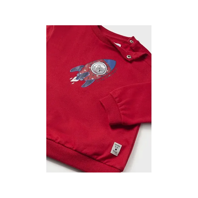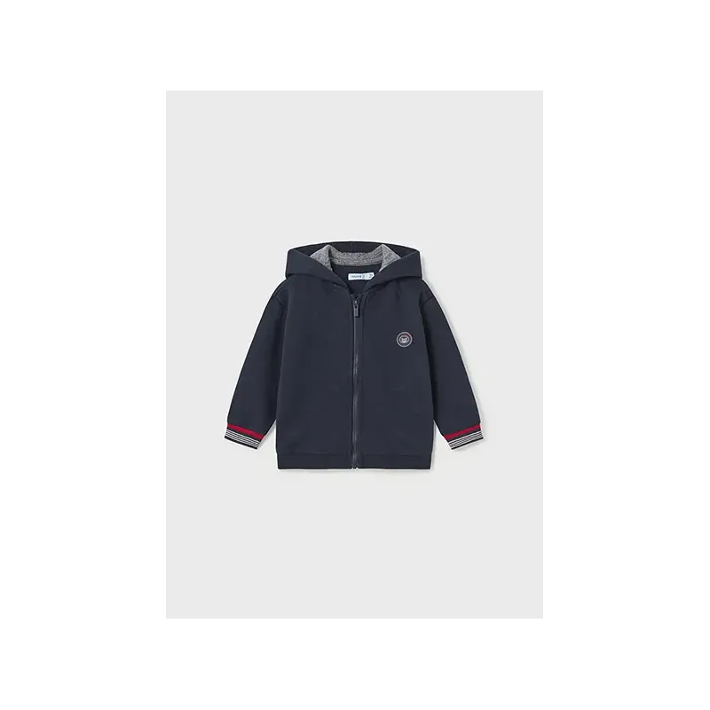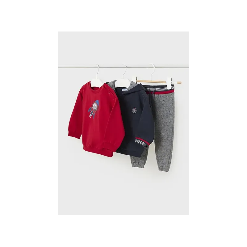 Dres dla chłopca składający się z trzech elementów: bluzy, długich sportowych spodni i pasującej koszulki. Koszulka z zapięciem na ramieniu. Dresowe spodnie z regulowaną gumką w pasie. Bluza bez kaptura zapinana na zamek. Skład: 95% Bawełna, 5% Elastan.