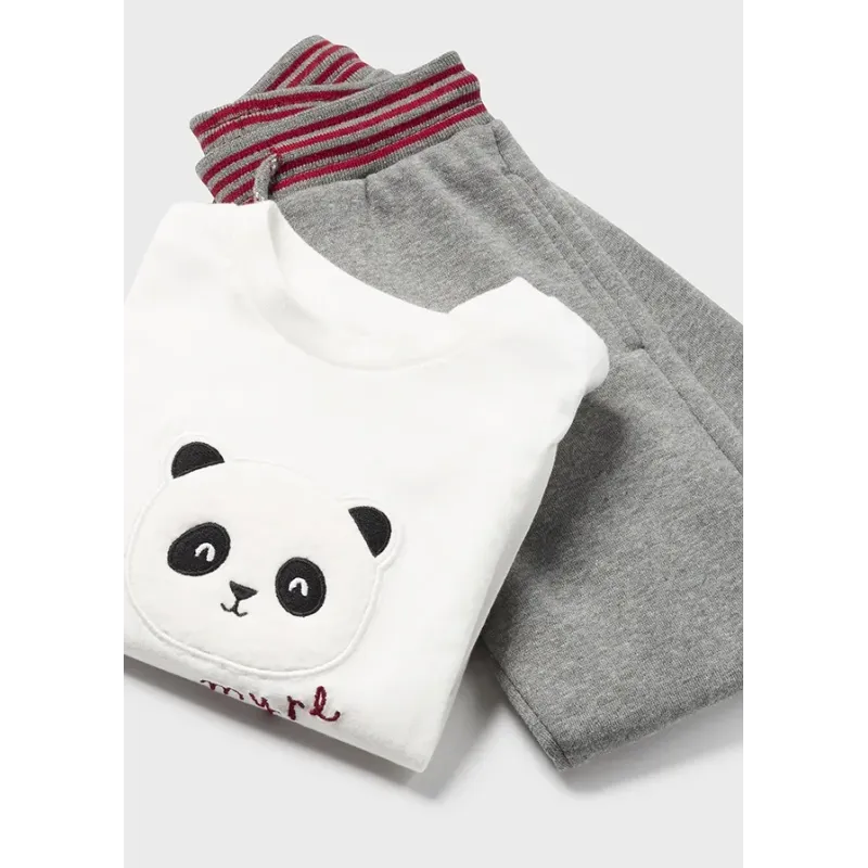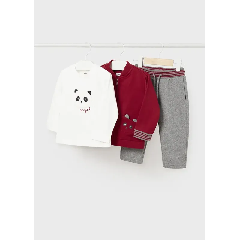 Bluza z dwiema parami pasujących spodni dla chłopca. Bluza wkładana przez głowę. Okrągły dekolt. Zapięcie na zatrzaski na plecach. Projekt z haftem. Spodnie dresowe typu jogger. Skład: 60% Bawełna, 39% Poliester, 1% Elastan.