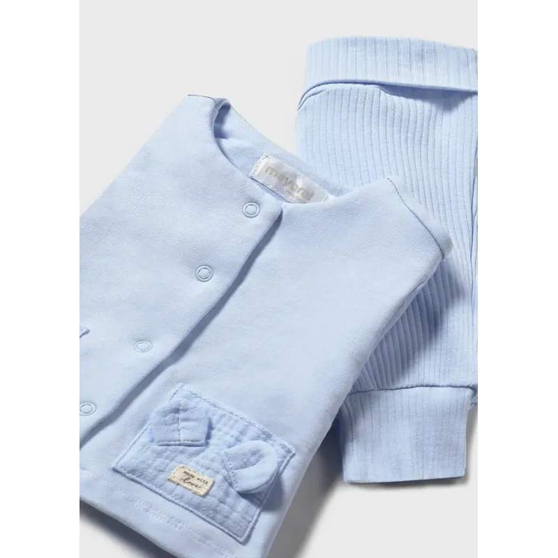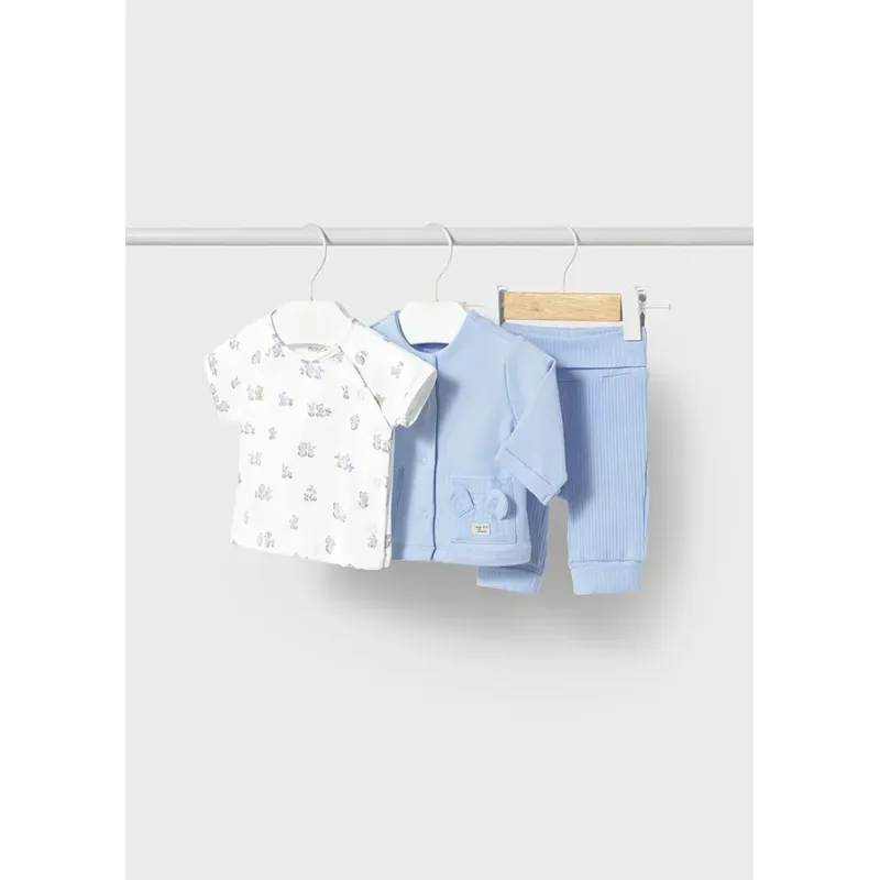 Bluza z dwiema parami pasujących spodni dla chłopca. Bluza wkładana przez głowę. Okrągły dekolt. Zapięcie na zatrzaski na plecach. Projekt z haftem. Spodnie dresowe typu jogger. Skład: 60% Bawełna, 39% Poliester, 1% Elastan.