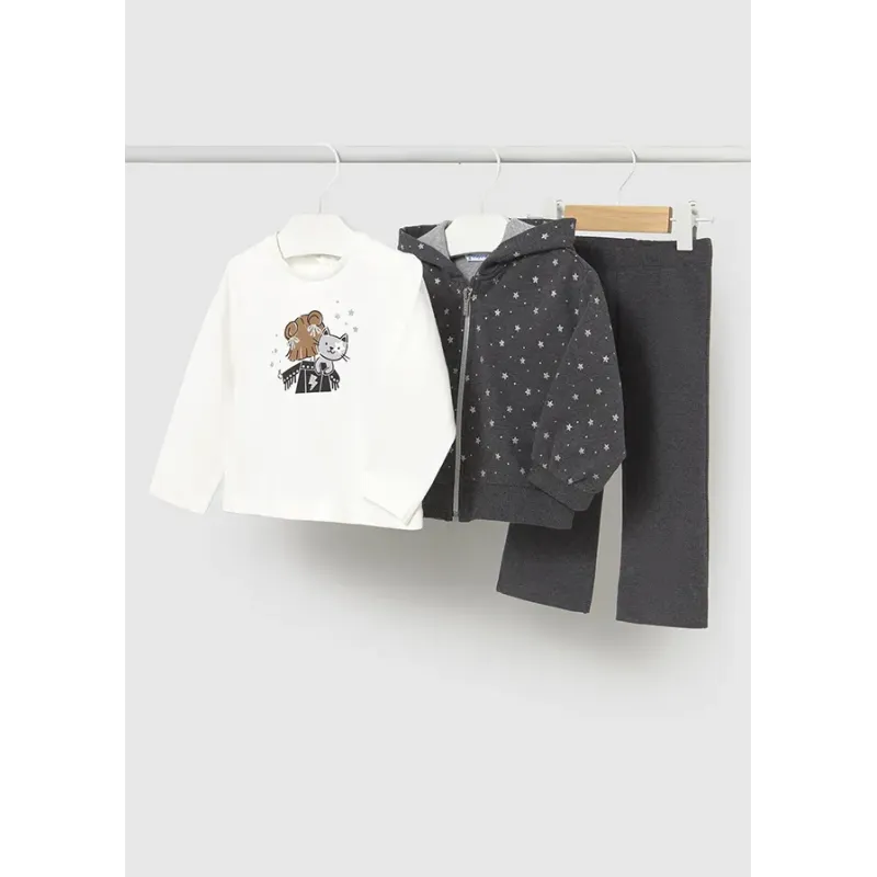 Dres 3 częściowy dla dziewczynki od 6 do 36 miesięcy z detalami w kontrastowych kolorach.Bluza z długim rękawem. Kołnierz z kapturem. Zapięcie na środku na zamek błyskawiczny. Dół z elastyczną gumką dla lepszego dopasowania.