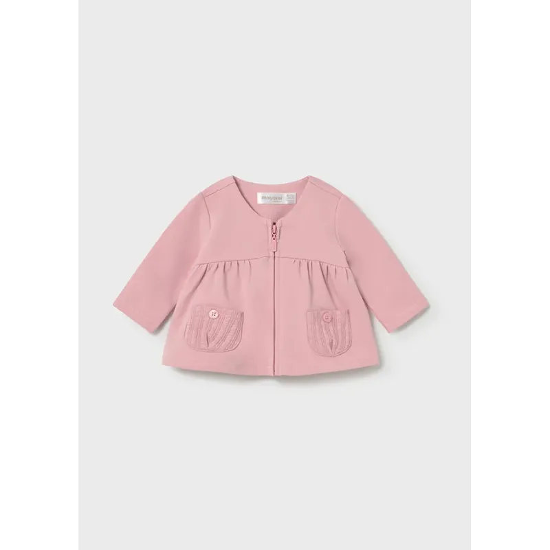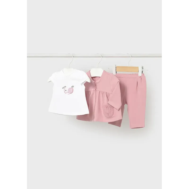 Dres 3 częściowy dla dziewczynki od 6 do 36 miesięcy z detalami w kontrastowych kolorach.Bluza z długim rękawem. Kołnierz z kapturem. Zapięcie na środku na zamek błyskawiczny. Dół z elastyczną gumką dla lepszego dopasowania.