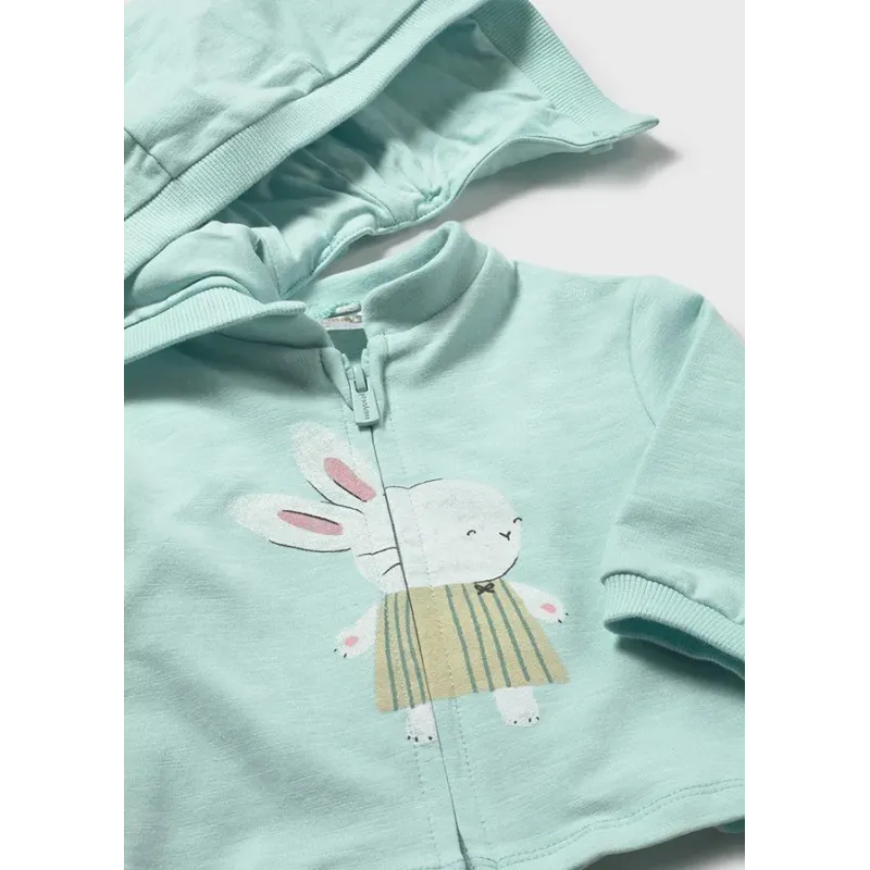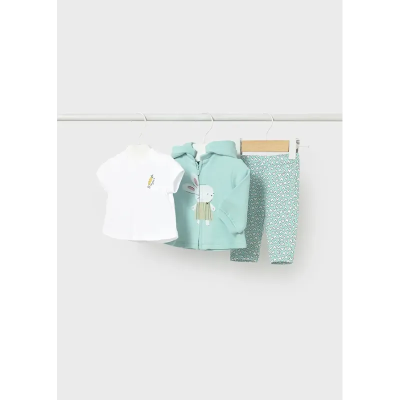 Dres 3 częściowy dla dziewczynki od 6 do 36 miesięcy z detalami w kontrastowych kolorach.Bluza z długim rękawem. Kołnierz z kapturem. Zapięcie na środku na zamek błyskawiczny. Dół z elastyczną gumką dla lepszego dopasowania.