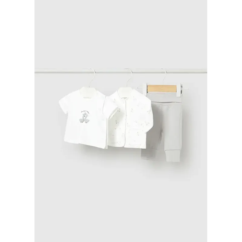 Dres dla chłopca Baby składający się z trzech ubranek: bluzy i dwóch par sportowych spodni, jednych długich i jednych krótkich. Wygodna dzianina przyjemna w dotyku. Bluza z długim rękawem dla chłopca Baby ze ściągaczami w kontrastowych kolorach.