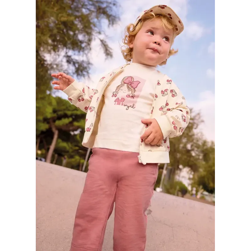 Dres 3 częściowy dla dziewczynki od 6 do 36 miesięcy z detalami w kontrastowych kolorach.Bluza z długim rękawem. Kołnierz z kapturem. Zapięcie na środku na zamek błyskawiczny. Dół z elastyczną gumką dla lepszego dopasowania.