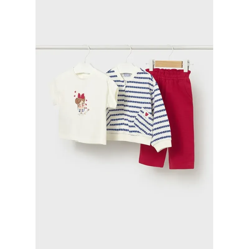 Dres 3 częściowy dla dziewczynki od 6 do 36 miesięcy z detalami w kontrastowych kolorach.Bluza z długim rękawem. Kołnierz z kapturem. Zapięcie na środku na zamek błyskawiczny. Dół z elastyczną gumką dla lepszego dopasowania.