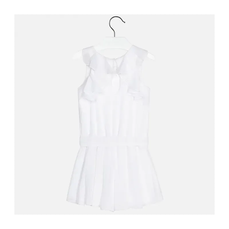 Krótki kombinezon na ramiączkach dla dziewczynki. Ozdobne zapięcie z przodu na guziki. Model z dekoracyjnymi falbanami na dole ubranka. Ozdoby: aplikacje w postaci kokardek na ramionach. Skład:98% Poliester, 2% Elastan