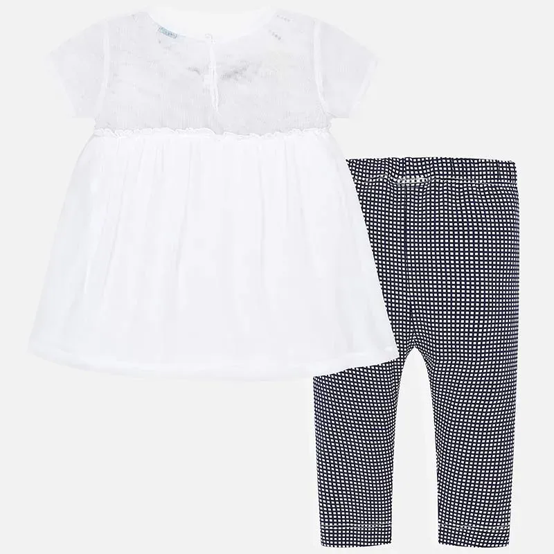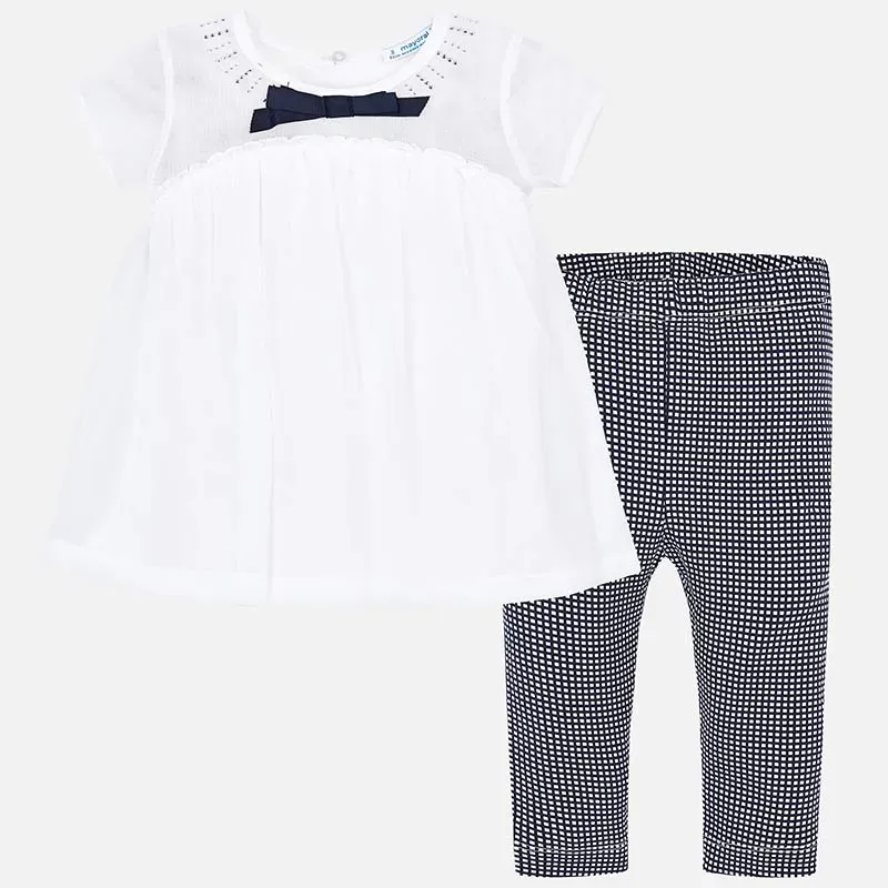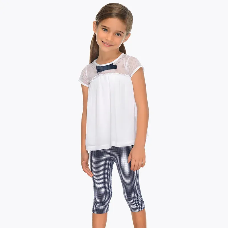 Komplet dwóch artykułów składający się z koszulki ze spodniami typu leginsy dla dziewczynki. Bluzka z krótkim rękawem. Okrągły dekolt. Linia nieformalna o luźnym kroju z długością do bioder.