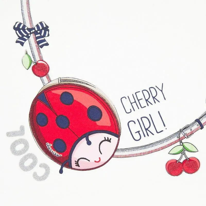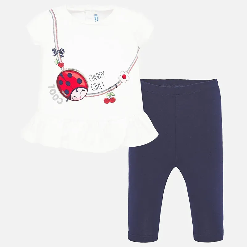 Komplet składający się z koszulki i legginsów typu kolarki dla dziewczynki. Koszula z krótkim rękawem i wycięciem na ramionach. Okrągły dekolt. Ozdoby: grafika na przodzie. Gładkie kolarki z elastyczną gumką w pasie. Koszulka: 100% Bawełna