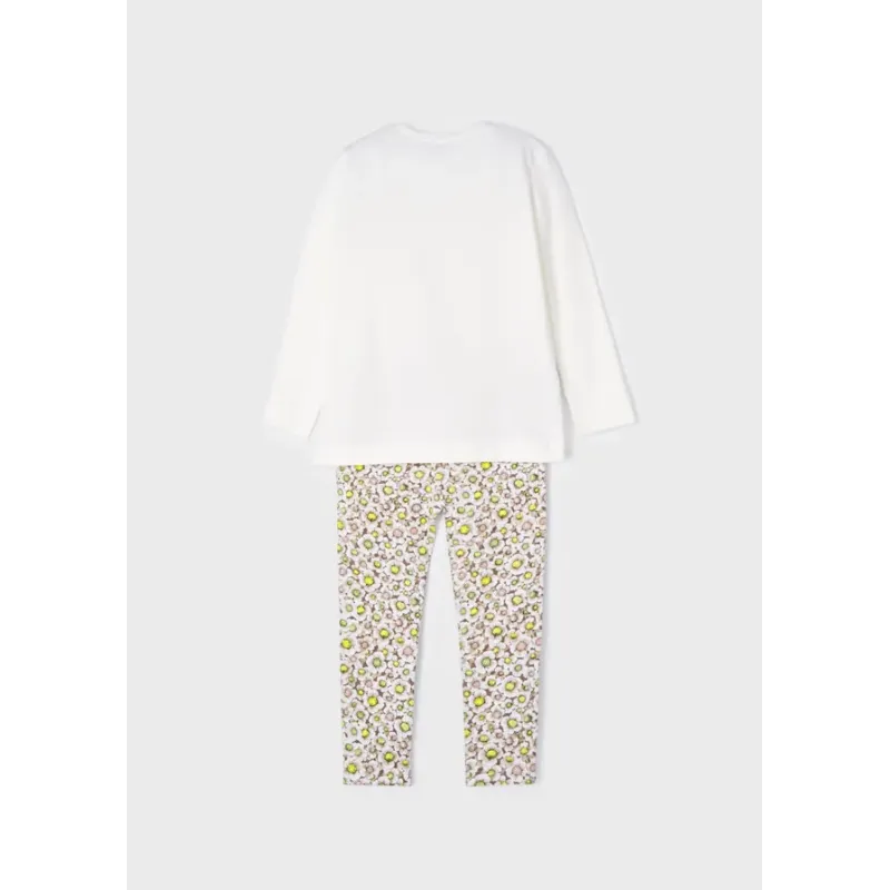 Komplet dla dziewczynki składający się z koszulki i leginsów we wzory. Koszulka z długim rękawem. Okrągły dekolt. Spodnie typu leginsy.