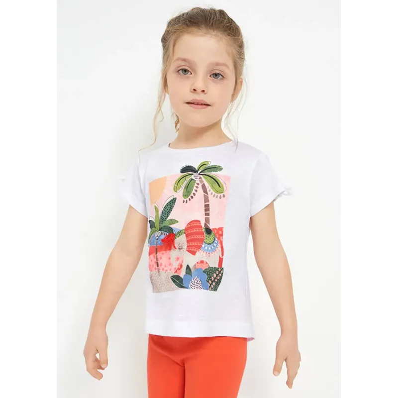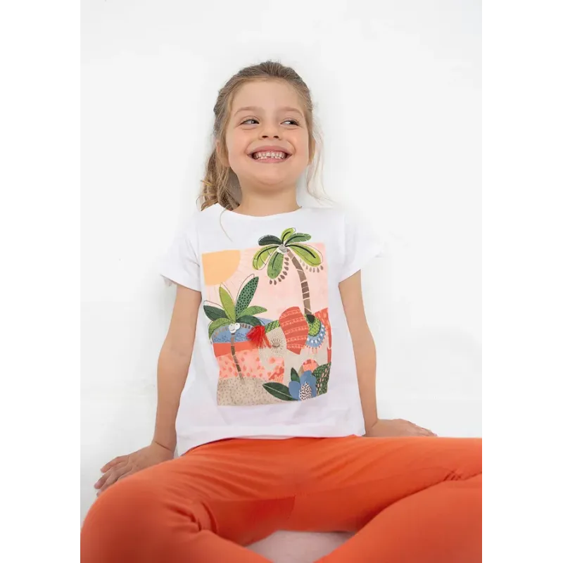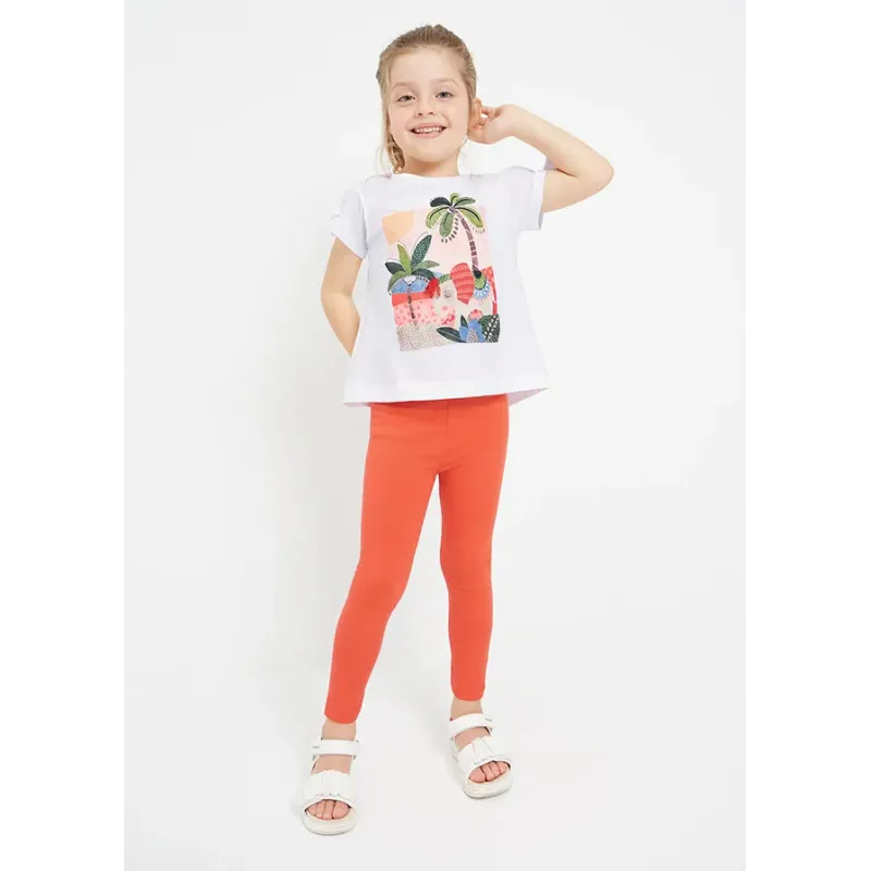 Komplet 2-częściowy z bawełny zrównoważonej dla dziewczynki. Komplet koszulka i długie spodnie typu leginsy dla dziewczynki. Koszulka z krótkim rękawem dla dziewczynki. Okrągły dekolt. Gładkie leginsy.