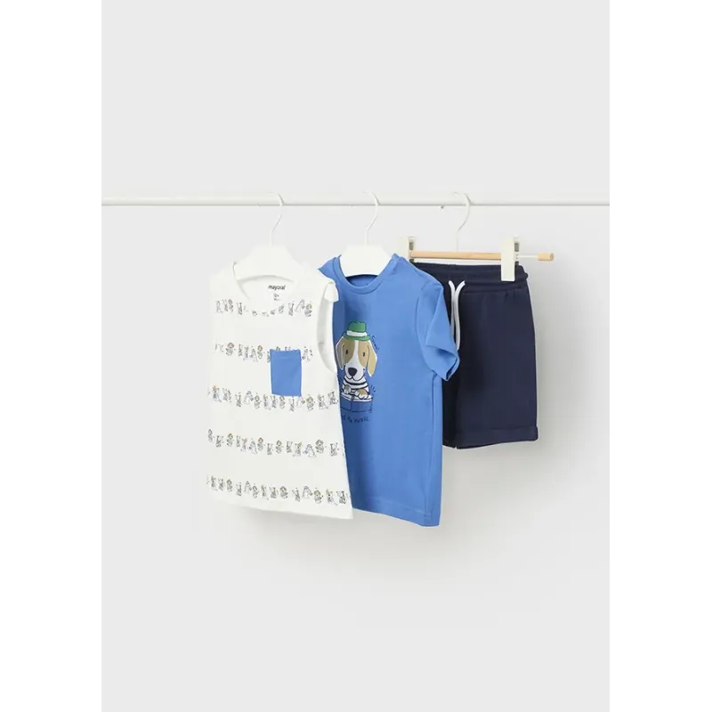 Komplet 3-częściowy z bawełny zrównoważonej dla chłopca. Komplet trzech ubranek, składający się z dwóch koszulek i dobranych krótkich spodni. Koszulka z krótkim rękawem. Okrągły dekolt. Artykuł wykonany ze 100% bawełny. Projekt z nadrukiem.