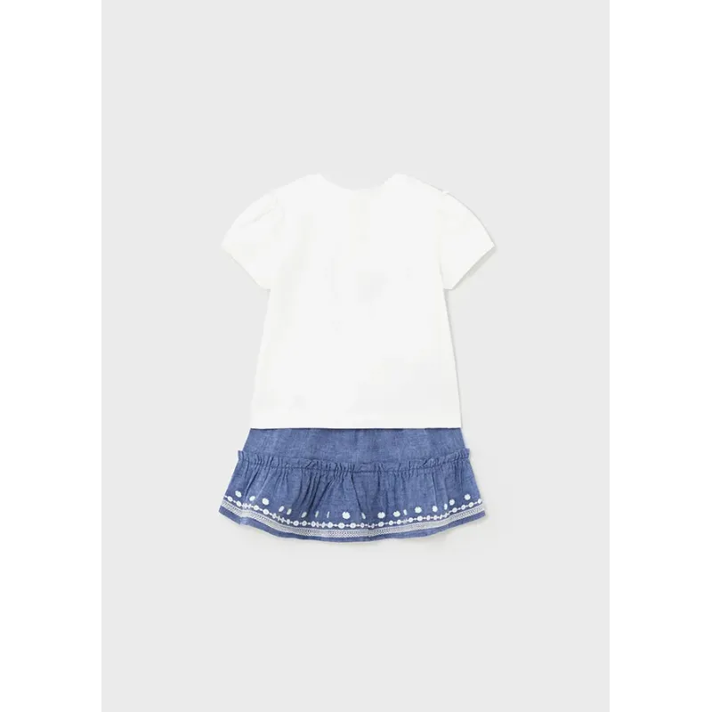 Komplet koszulka i pasująca spódniczka dla dziewczynki Baby. Delikatna i elastyczna bawełna. Koszulka z krótkim rękawem. Okrągły dekolt. Zapięcie na małe zatrzaski na plecach, które ułatwiają założenie ubranka. Ozdoby: grafika na przodzie, glitter.