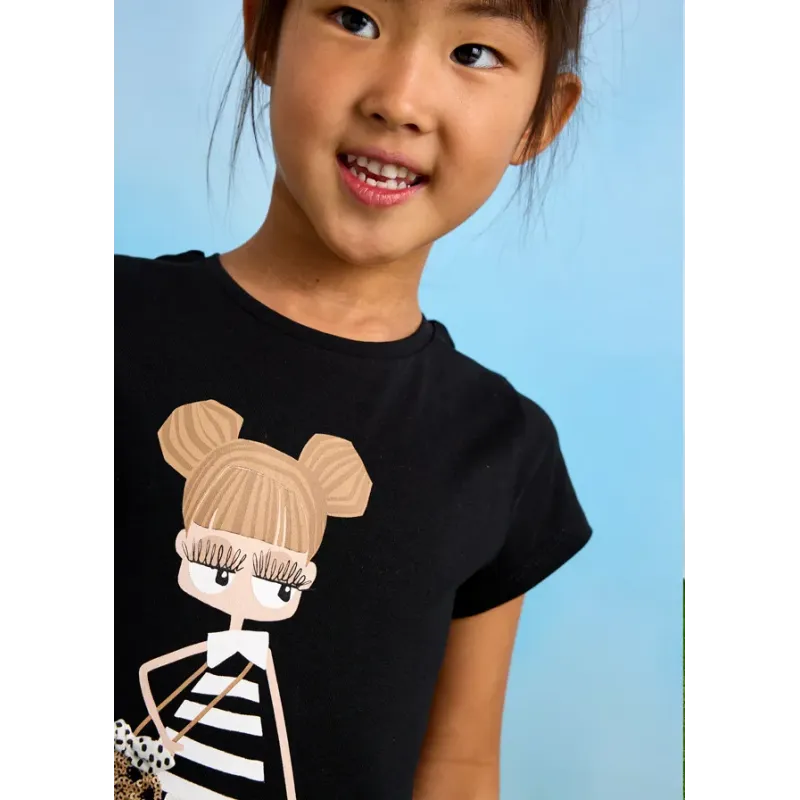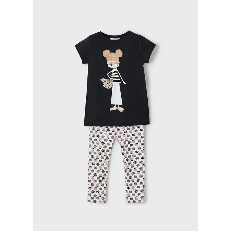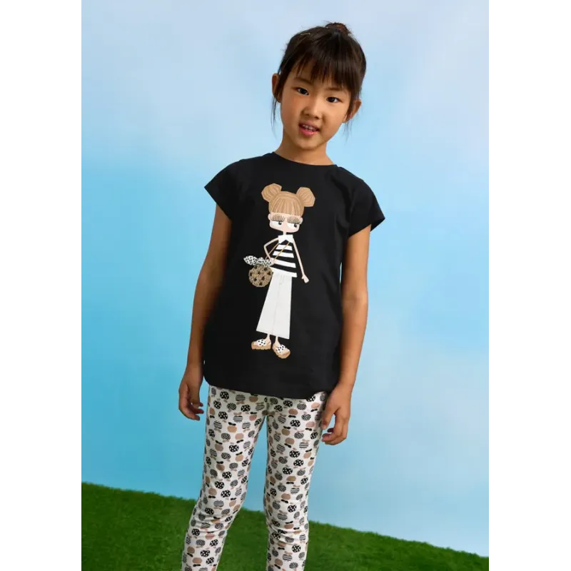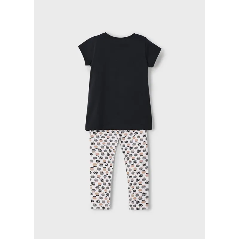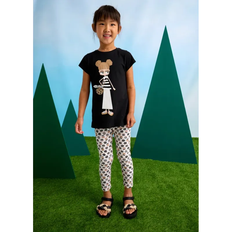 Komplet koszulka i długie spodnie typu legginsy dla dziewczynki. Koszulka z krótkim rękawem. Okrągły dekolt. Kolorowy nadruk z ozdobnymi elementami z materiału. Legginsy we wzory. Koszulka wykonana ze 100% bawełny. Legginsy: 95% Bawełna, 5% Elastan.
