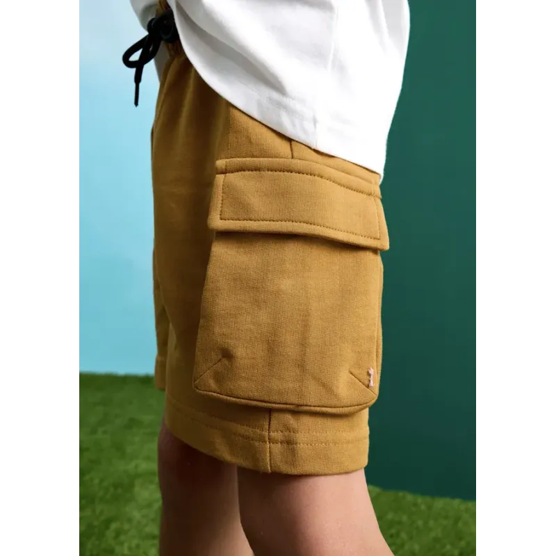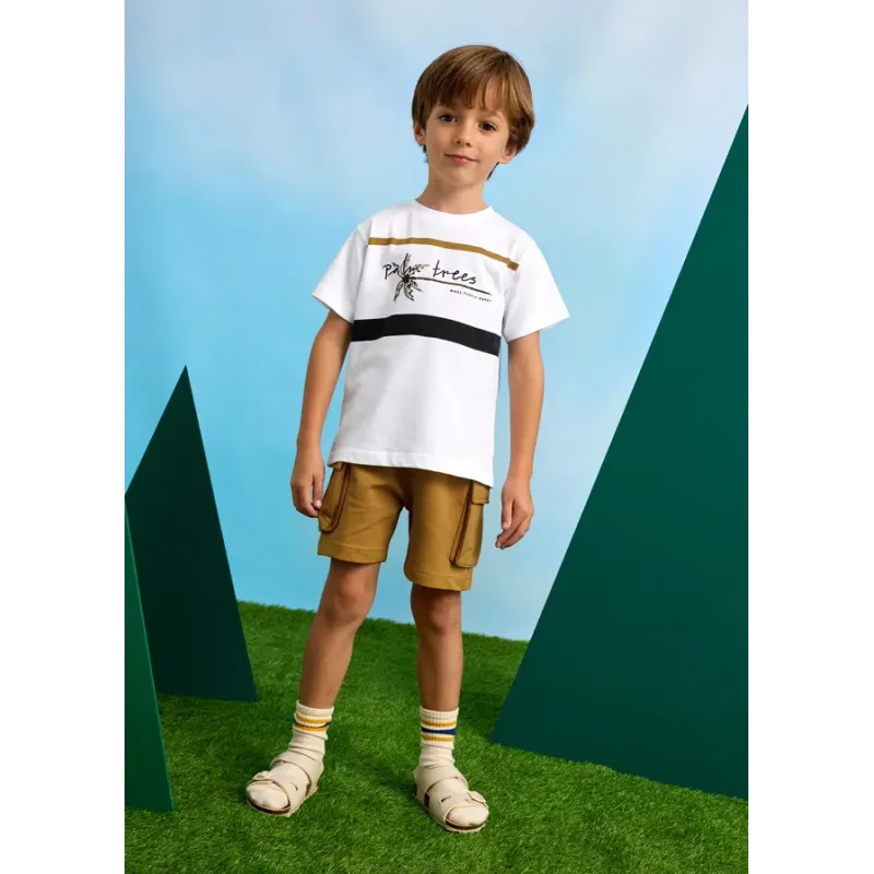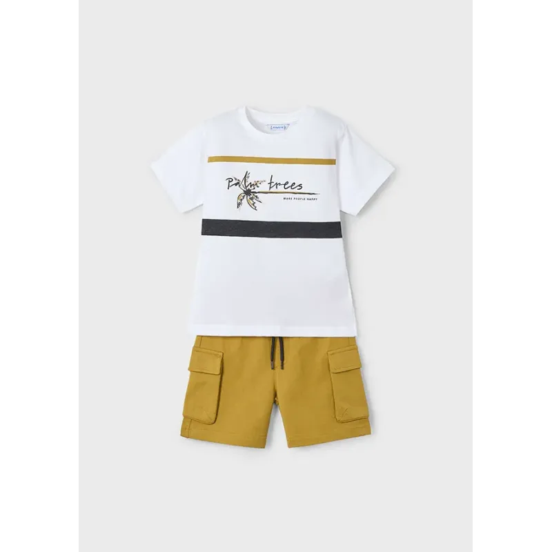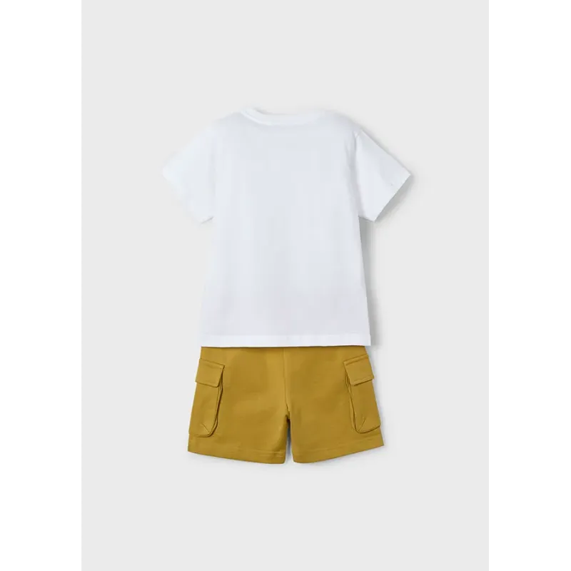 Komplet składający się z koszulki polo i pasujących krótkich spodni dla chłopca. Koszulka z krótkim rękawem. Zapięcie z przodu na guziki. Praktyczna kieszeń z przodu. Model z nadrukiem. Krótkie spodnie bermudy. Elastyczna gumka w pasie. Skład: 100% baweł