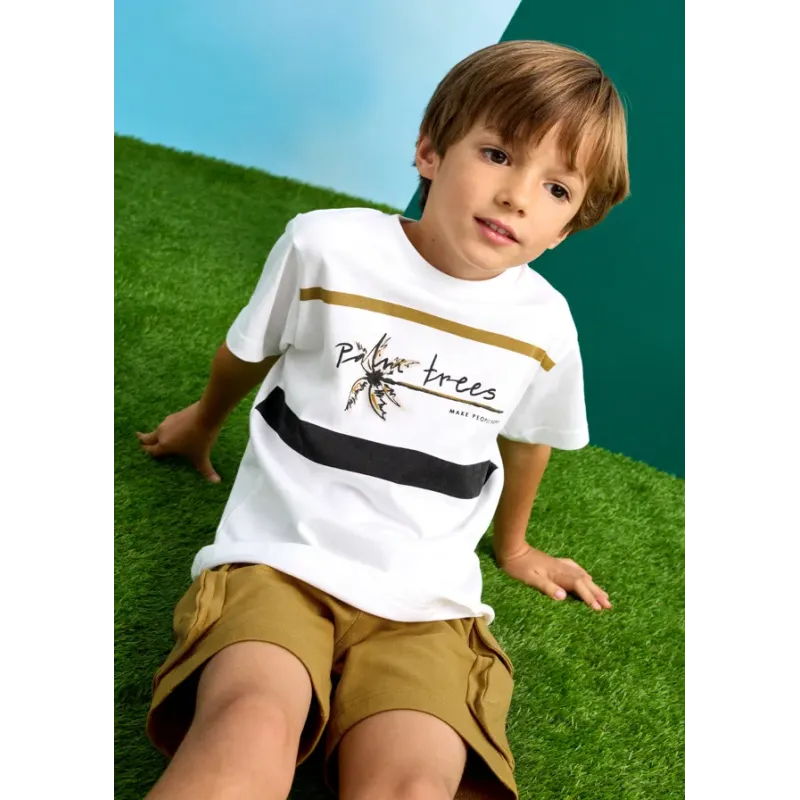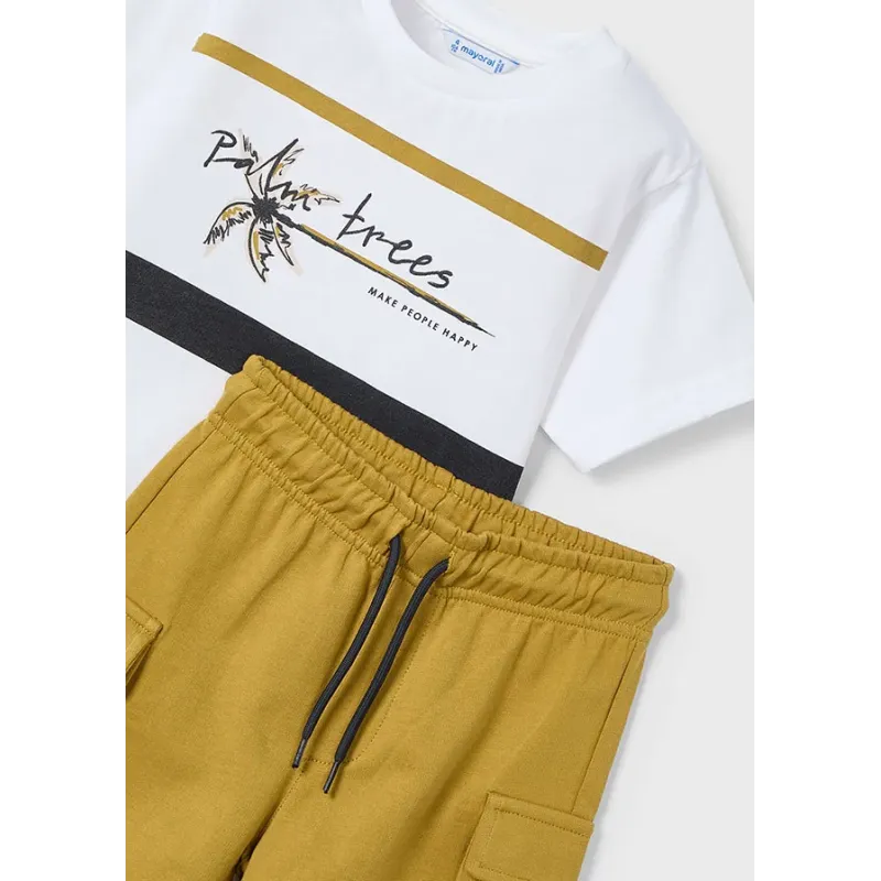 Komplet koszulka i bermudy dla chłopca. Koszulka z krótkim rękawem. Okrągły dekolt. Krótkie spodenki z elastycznym pasem, wykonane ze strukturalnej dzianiny. Artykuły wykonane ze 100% bawełny.