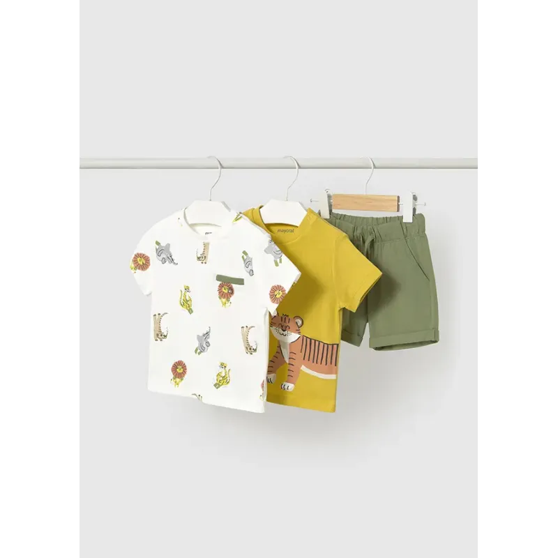 Komplet 3-częściowy dla chłopca. Komplet trzech ubranek, składający się z dwóch koszulek i dobranych krótkich spodni. Koszulki z krótkim rękawem we wzory. Zapięcie na zatrzaski na ramieniu. Gładkie krótkie spodenki. Skład: 100% bawełny.