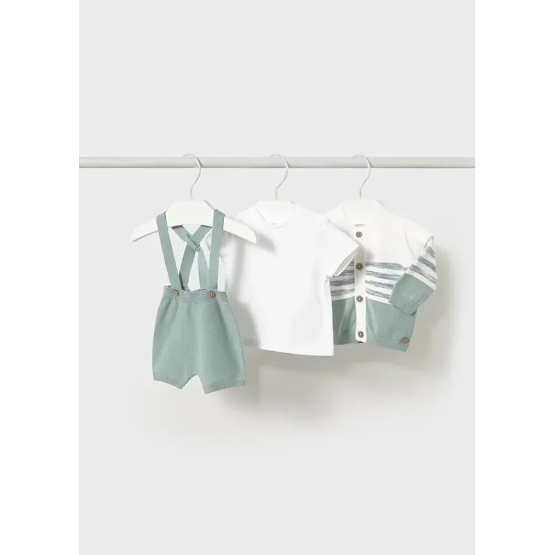 Komplet 3-częściowy dla chłopca składający się z krótkich spodenek ogrodniczek, koszulki z krótkim rękawkiem oraz swetra. Gładka koszulka zapinana na ramieniu. Okrągły dekolt. Ogrodniczki oraz sweterek wykonany ze 100% bawełny.