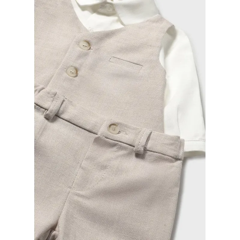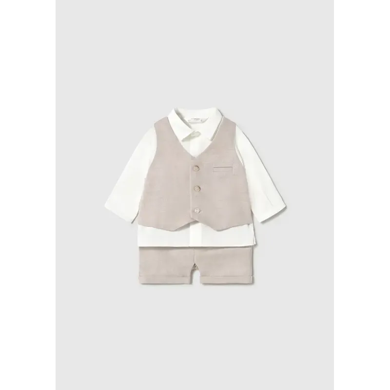 Komplet składający się z koszuli i pasujących krótkich spodni dla chłopca. Koszula z krótkim rękawem. Zapięcie z przodu na guziki. Praktyczna kieszeń z przodu. Model z nadrukiem. Krótkie spodnie typu bermudy.Elastyczna gumka w pasie. Wywinięte nogawki.